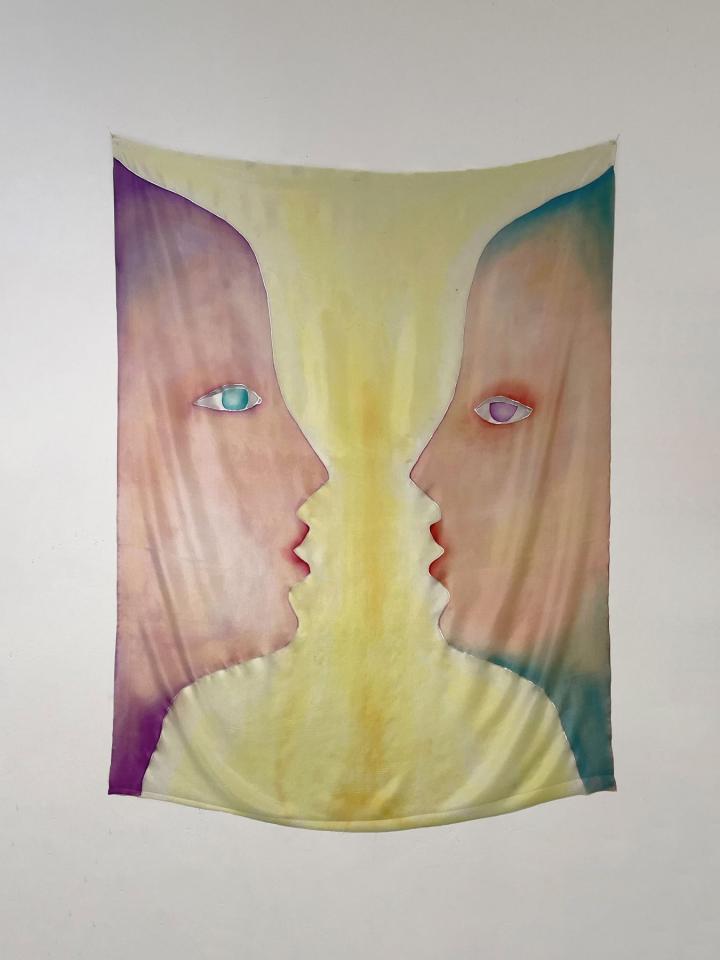 Sœurs, 2022, peinture sur soie, 110 x 90 cm, vue de l’exposition Con moto, 2022, Le Salon Reçoit, Toulouse