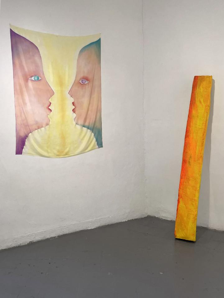 Sœurs, 2022, peinture sur soie, 110 x 90 cm, Sans titre, 2022, sculpture, plâtre et peinture, 120 x 15 x 10 cm, vue de l’exposition Con moto, 2022, Le Salon Reçoit, Toulouse