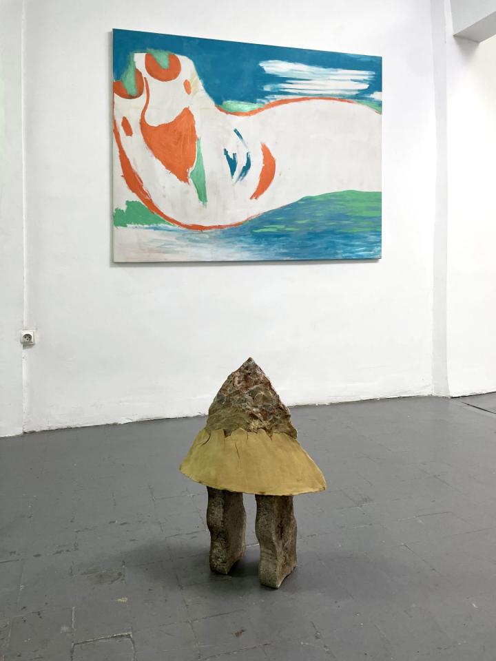 Con moto, 2022, peinture acrylique sur toile, 120 x 150 cm, Sans titre, 2022, marbre, terre et béton, 50 x 20 x 30 cm, vue de l’exposition Con moto, 2022, Le Salon Reçoit, Toulouse