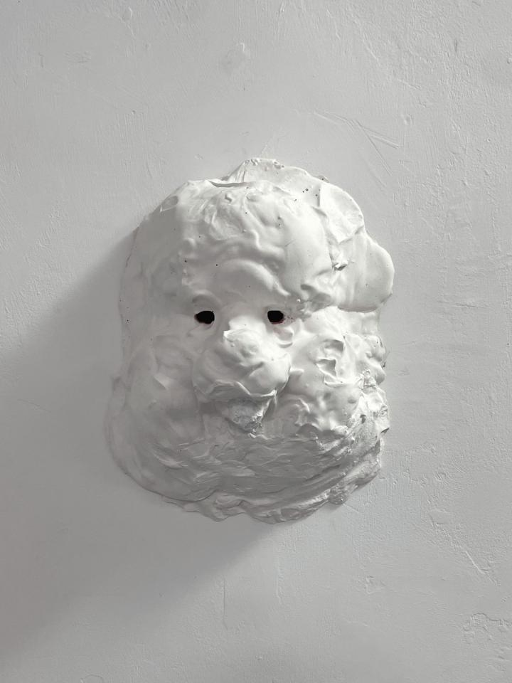 Tarte canin, 2022, plâtre, 25 x 20 x 5 cm, vue de l’exposition Con moto, 2022, Le Salon Reçoit, Toulouse
