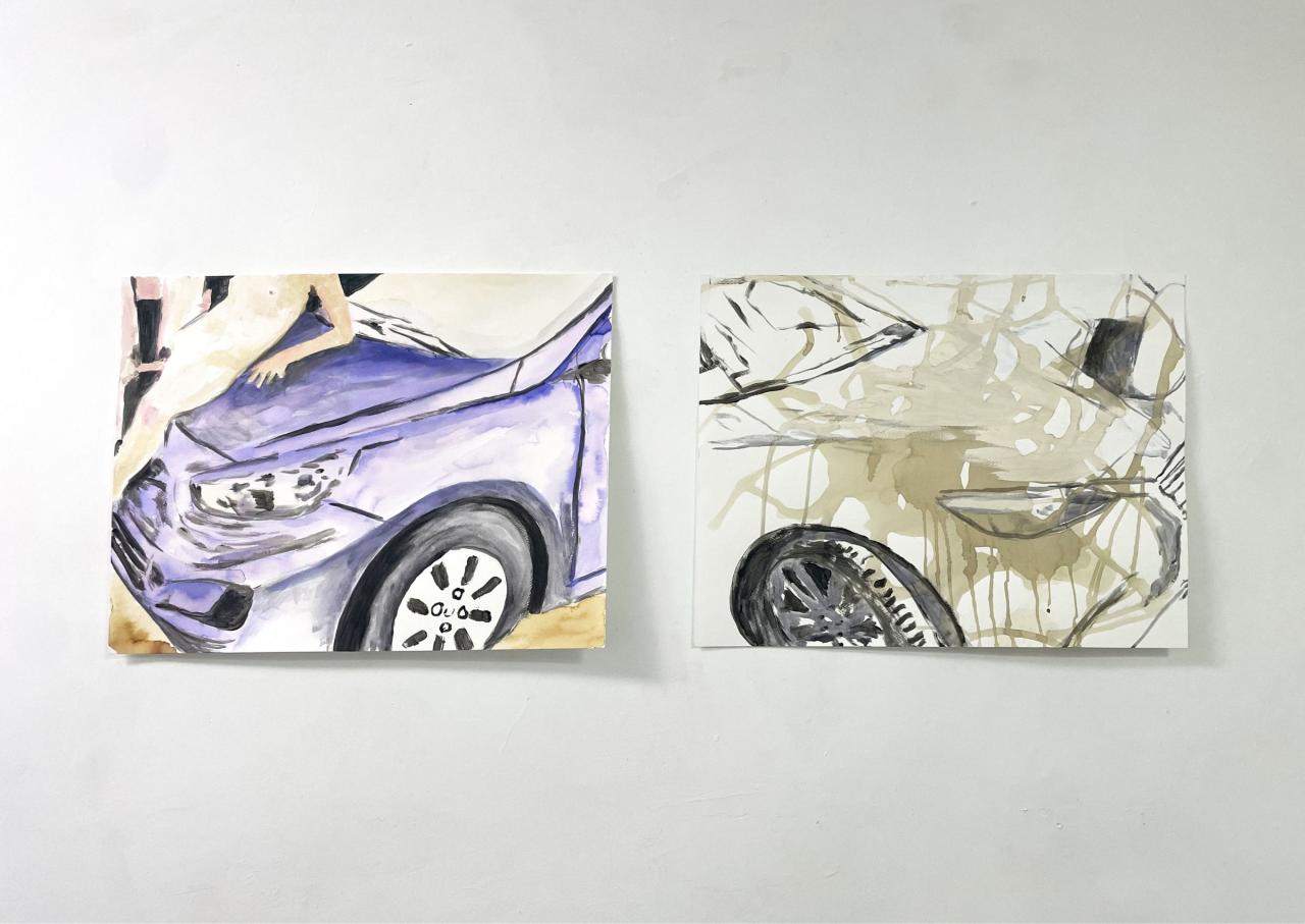 Click on me, 2022, dessin sur papier, 124 x 152 cm, L’Annonciation, 2020, peinture acrylique sur papier, 124 x 152 cm, vue de l’exposition Con moto, 2022, Le Salon Reçoit, Toulouse