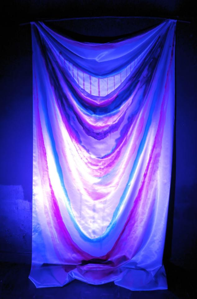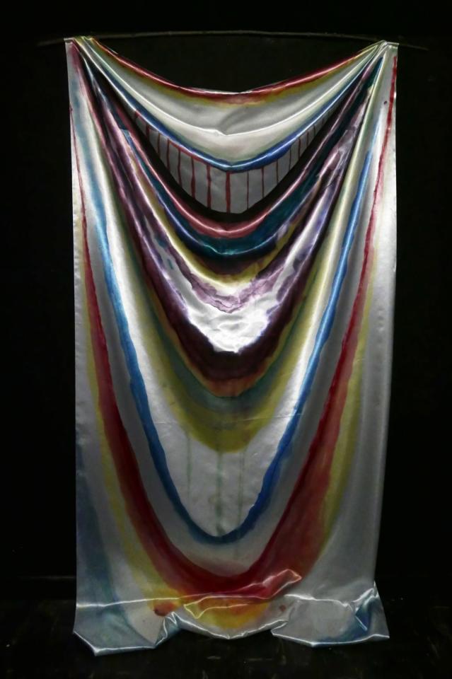 Sans titre, 2017, peinture sur satin, 200 x 100 cm, vue de l’exposition Déplacer la croûte, 2017, 19cannes, Toulouse