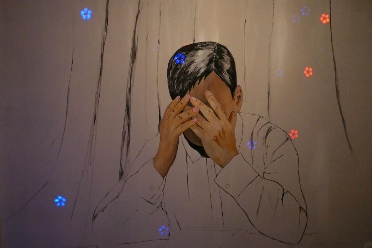 Michel, 2017, peinture acrylique, 20 x 30 cm, vue de l’exposition Déplacer la croûte, 2017, 19cannes, Toulouse