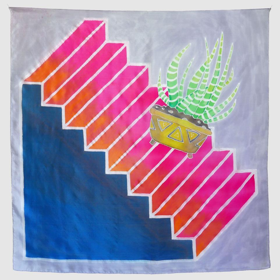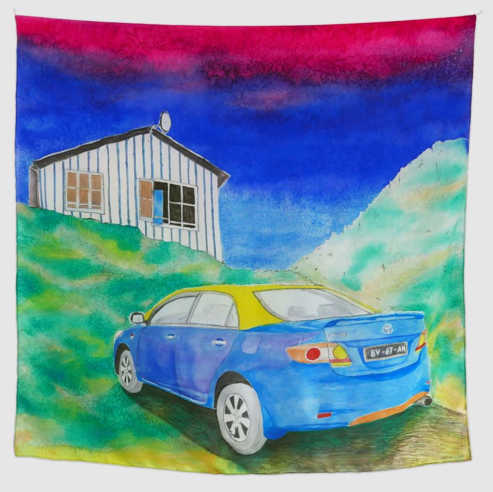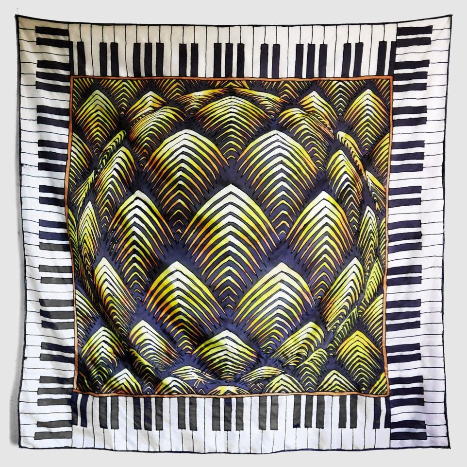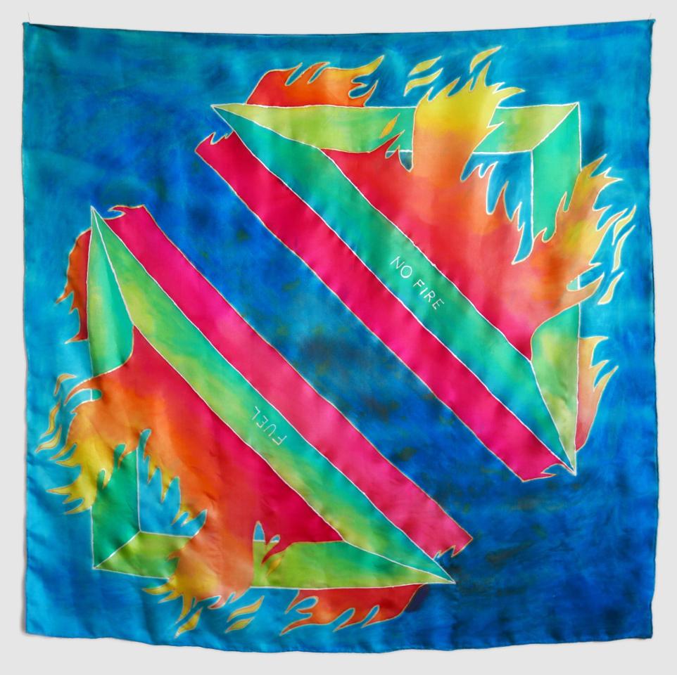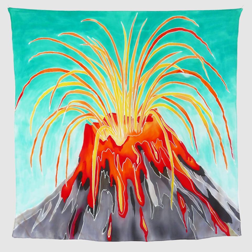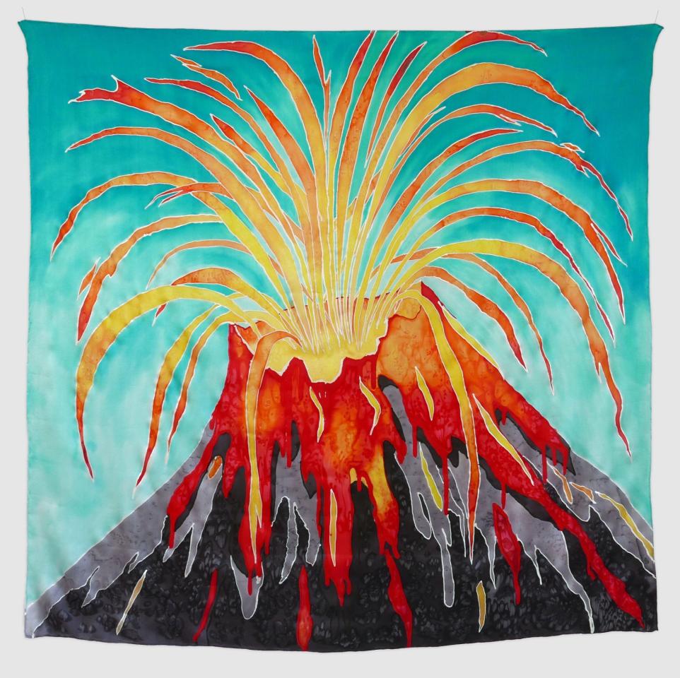 Le choix de la peinture sur soie n’est pas anodin. Marianne Plo l’inscrit dans les arts modestes. En occident, cette pratique est associée aux loisirs créatifs, elle est aussi assignée à un territoire présupposé du féminin. L’artiste s’est alors formée aux différentes techniques auprès d’un « club de mamies ». Depuis elle ne cesse d’expérimenter en affectionnant les maladresses des traits, le manque de précision, les imprévus et les accidents. Elle s’affirme en tant que coloriste. Elle navigue entre les styles, entre les registres, entre les époques et entre les genres. Du portrait à la nature (pas vraiment) morte, elle peint des paysages, des animaux, des motifs répétés de manière quasi psychédélique. Elle nous invite à nous immerger dans un flot d’images fluides et mouvantes, dont les échelles et les plans varient du microcosme au macrocosme. De la montagne à l’intérieur de la roche, d’une déesse antique (réelle ou imaginaire), d’un feu à la lumière diffractée, l’artiste déambule dans un mille-feuille qui embrasse la mémoire, l’imaginaire, l’expérience intime, le temps, l’espace et la culture.
