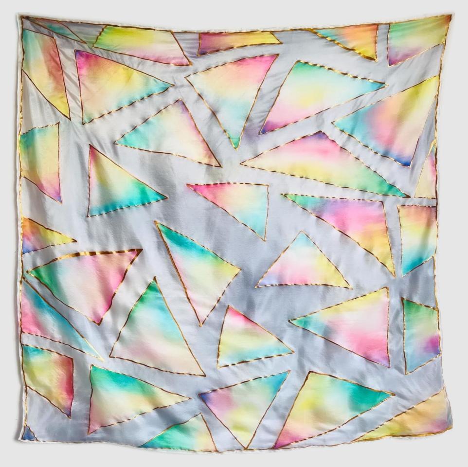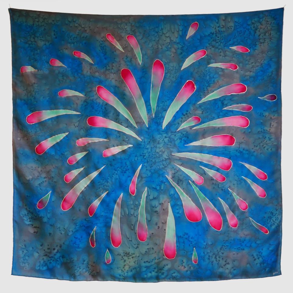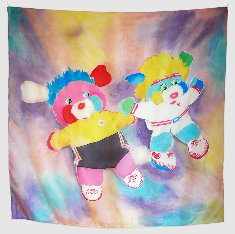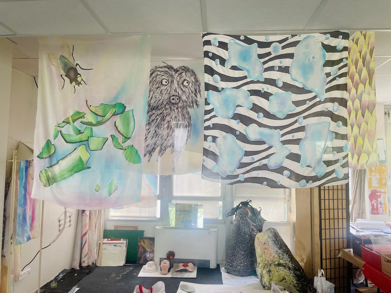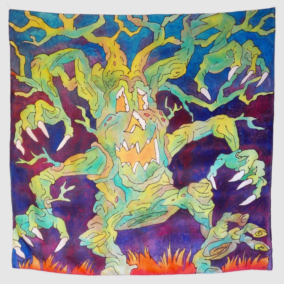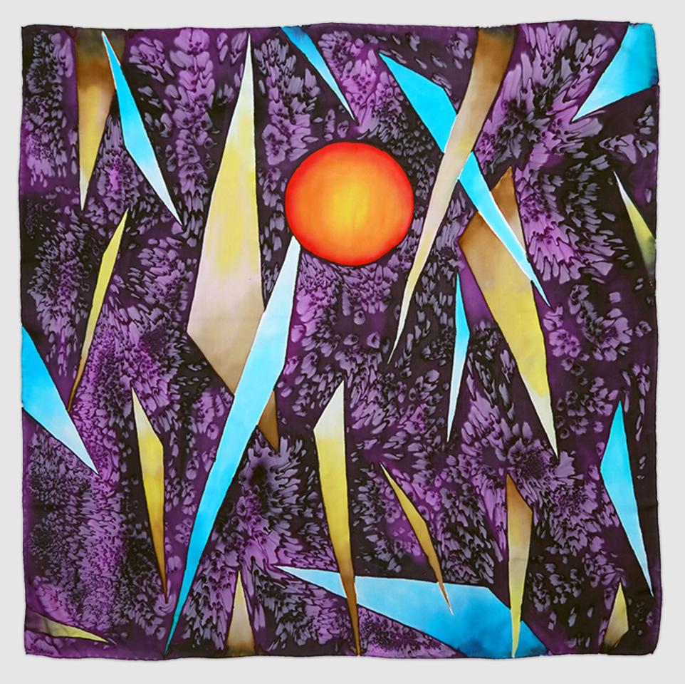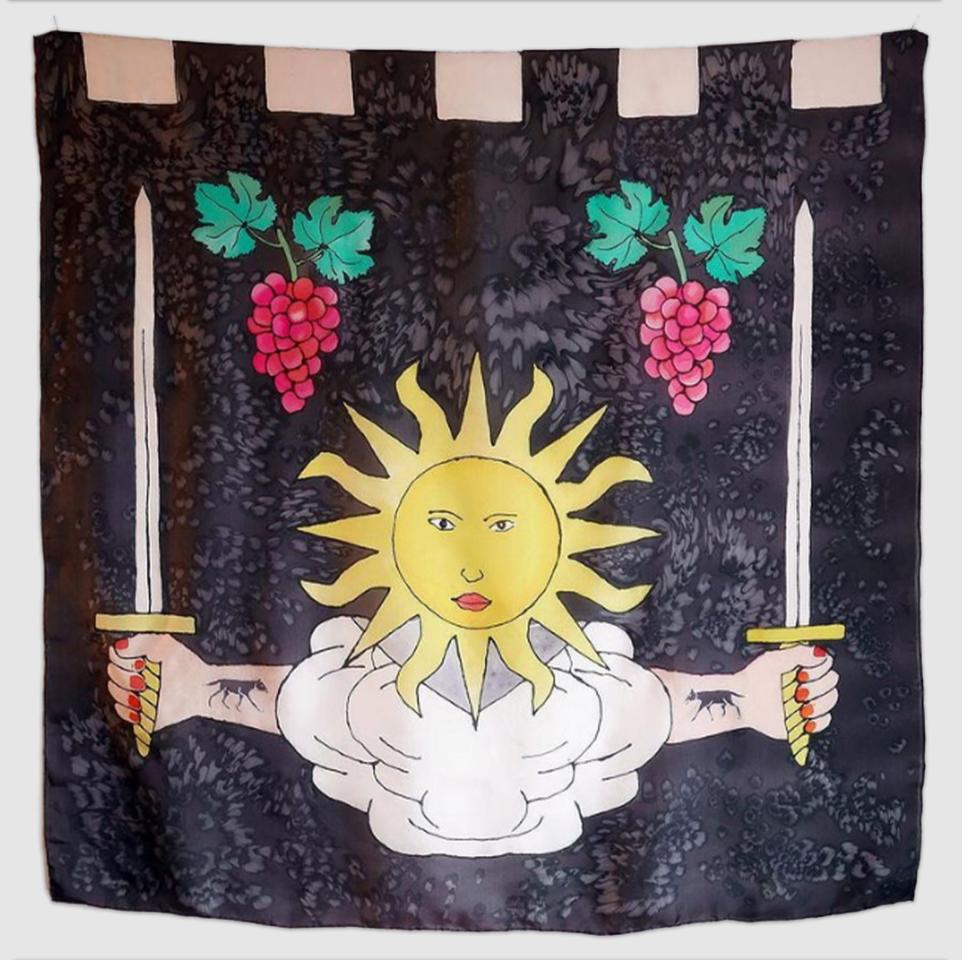 Le choix de la peinture sur soie n’est pas anodin. Marianne Plo l’inscrit dans les arts modestes. En occident, cette pratique est associée aux loisirs créatifs, elle est aussi assignée à un territoire présupposé du féminin. L’artiste s’est alors formée aux différentes techniques auprès d’un « club de mamies ». Depuis elle ne cesse d’expérimenter en affectionnant les maladresses des traits, le manque de précision, les imprévus et les accidents. Elle s’affirme en tant que coloriste. Elle navigue entre les styles, entre les registres, entre les époques et entre les genres. Du portrait à la nature (pas vraiment) morte, elle peint des paysages, des animaux, des motifs répétés de manière quasi psychédélique. Elle nous invite à nous immerger dans un flot d’images fluides et mouvantes, dont les échelles et les plans varient du microcosme au macrocosme. De la montagne à l’intérieur de la roche, d’une déesse antique (réelle ou imaginaire), d’un feu à la lumière diffractée, l’artiste déambule dans un mille-feuille qui embrasse la mémoire, l’imaginaire, l’expérience intime, le temps, l’espace et la culture.