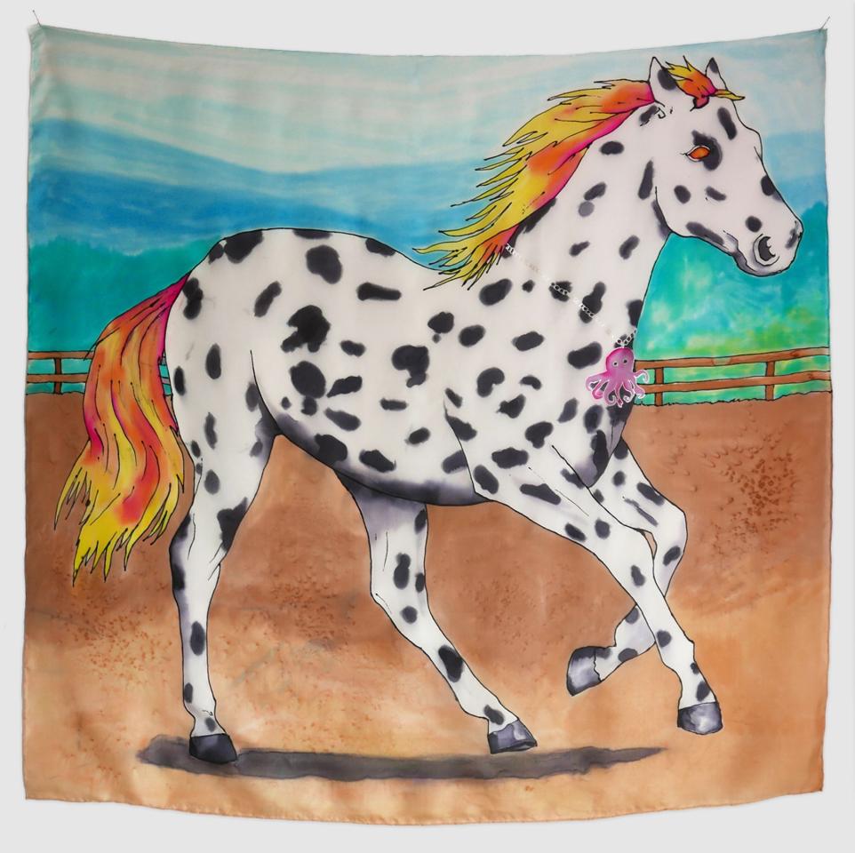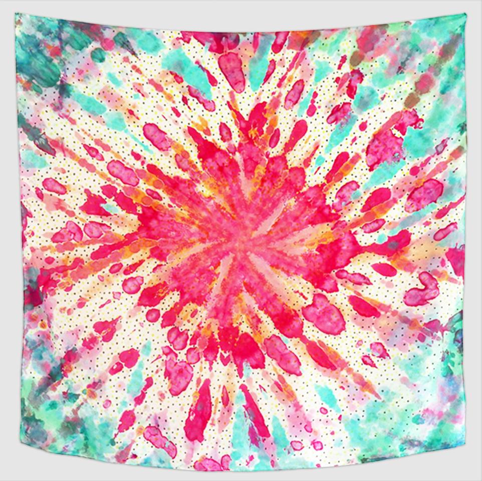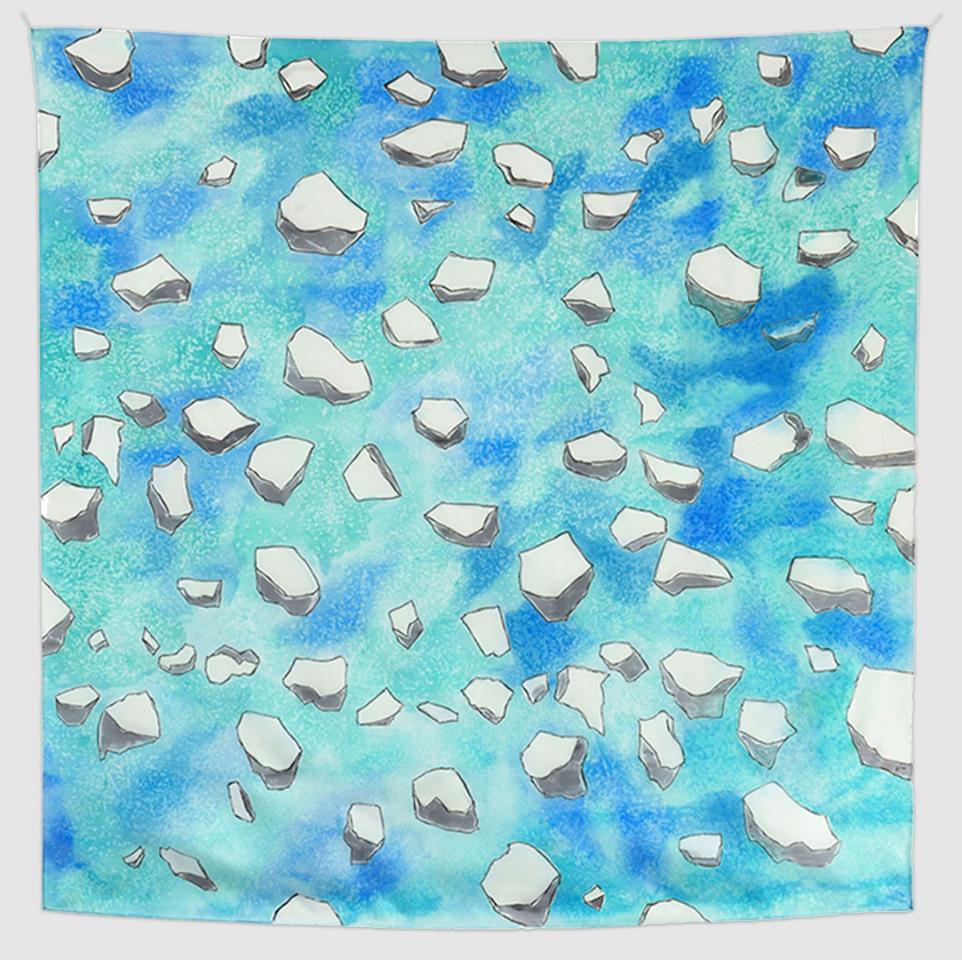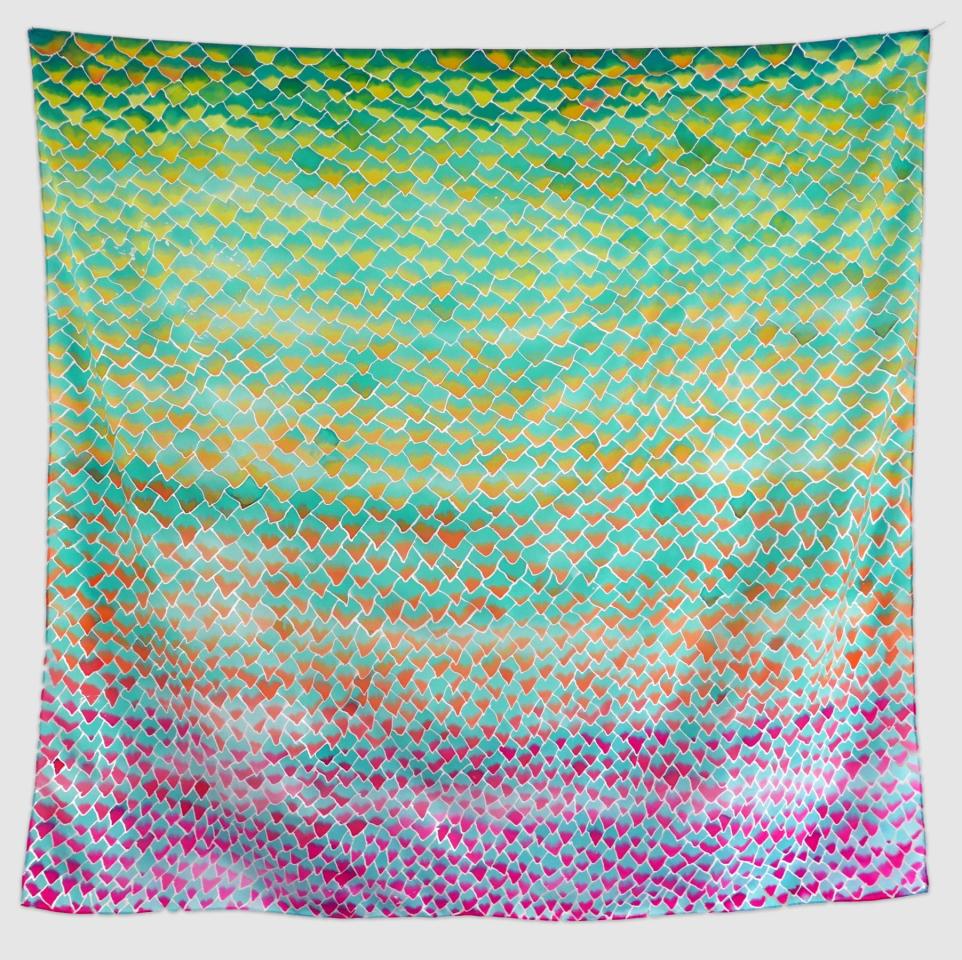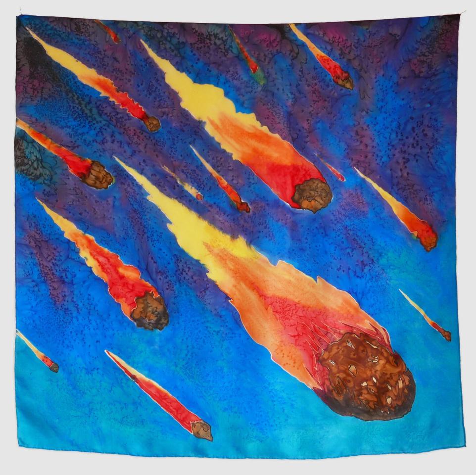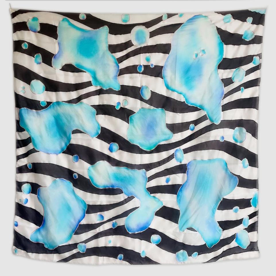 Le choix de la peinture sur soie n’est pas anodin. Marianne Plo l’inscrit dans les arts modestes. En occident, cette pratique est associée aux loisirs créatifs, elle est aussi assignée à un territoire présupposé du féminin. L’artiste s’est alors formée aux différentes techniques auprès d’un « club de mamies ». Depuis elle ne cesse d’expérimenter en affectionnant les maladresses des traits, le manque de précision, les imprévus et les accidents. Elle s’affirme en tant que coloriste. Elle navigue entre les styles, entre les registres, entre les époques et entre les genres. Du portrait à la nature (pas vraiment) morte, elle peint des paysages, des animaux, des motifs répétés de manière quasi psychédélique. Elle nous invite à nous immerger dans un flot d’images fluides et mouvantes, dont les échelles et les plans varient du microcosme au macrocosme. De la montagne à l’intérieur de la roche, d’une déesse antique (réelle ou imaginaire), d’un feu à la lumière diffractée, l’artiste déambule dans un mille-feuille qui embrasse la mémoire, l’imaginaire, l’expérience intime, le temps, l’espace et la culture.