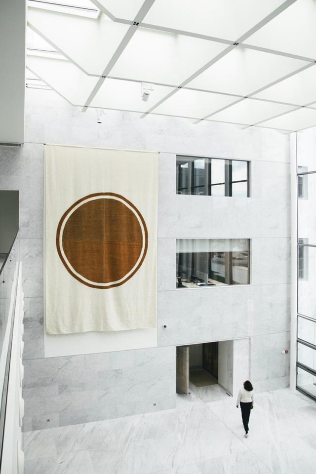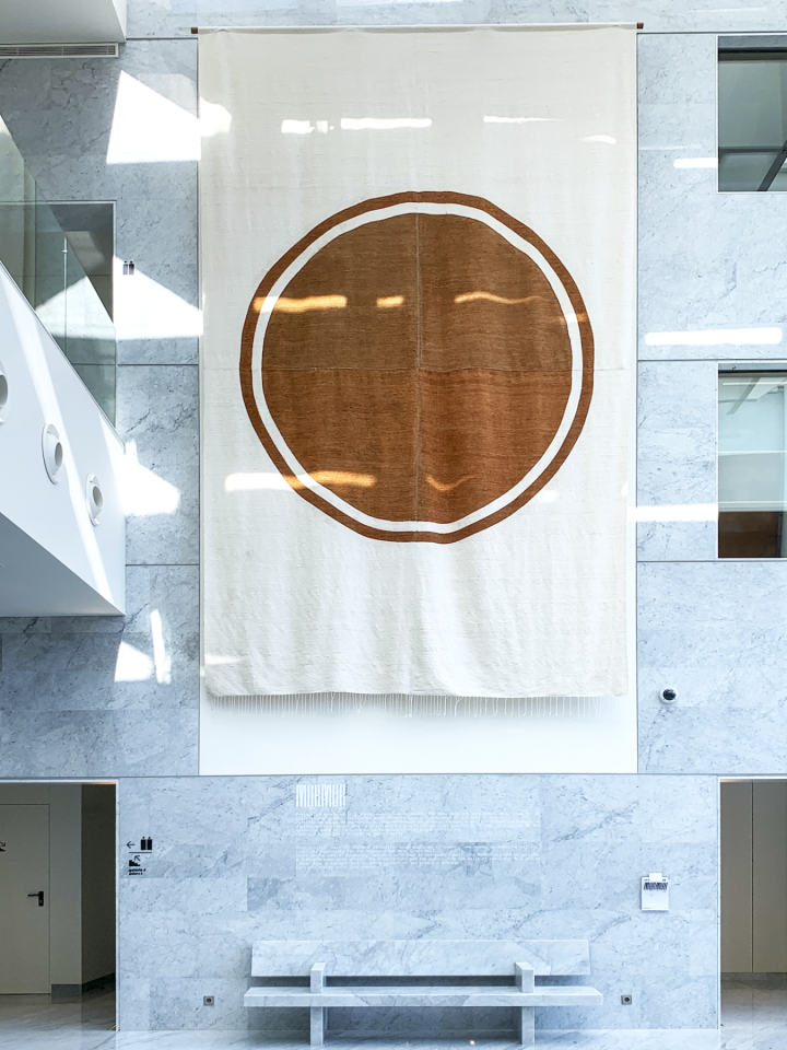 On the opposite wall, Azetta #1 weaves silences and stories into a woollen frame. In the Berber language, azetta means both ‘loom’ and ‘honeycomb’. Berber women refer to the henna-painted sections of their rugs as aglif n’tizwa, meaning ‘hive’ or ‘swarm’.