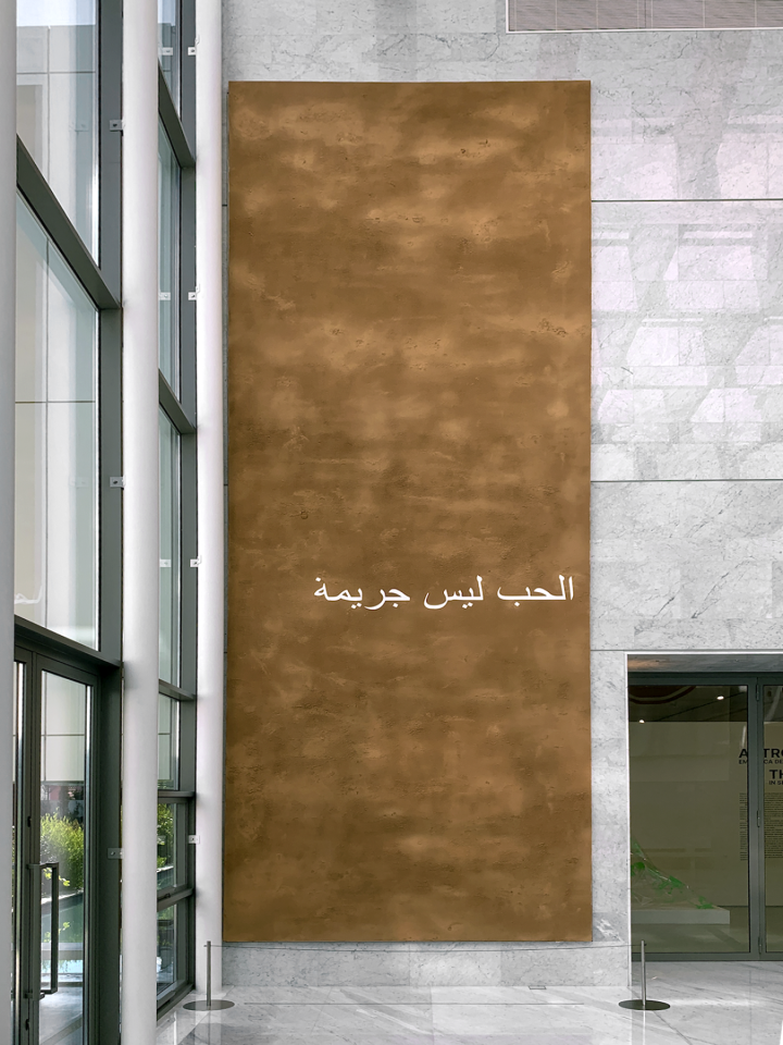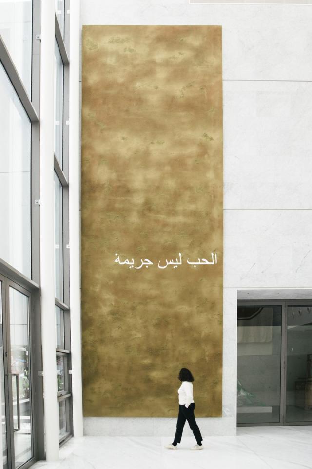Situated at the heart of the installation Harem, L’amour n’est pas un crime is a monumental canvas painting (nine by three metres) saturated with henna and other organic components, bearing the inscription in Arabic for: “Love is not a crime”. This phrase is a cry of defiance by women in their struggle for rights and new freedoms.