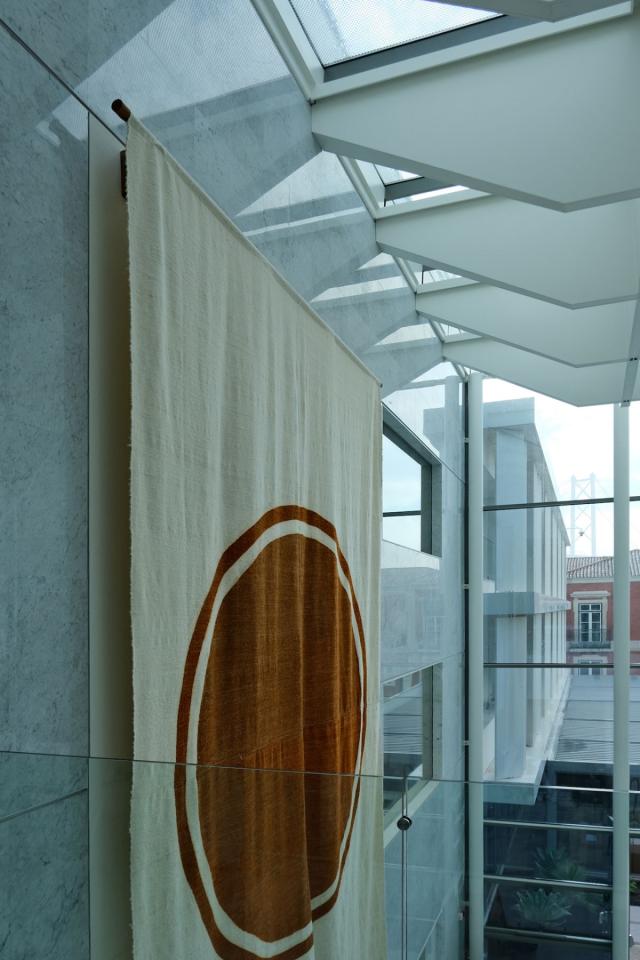 Azetta #1, 2025, installation, laine tissée et henné, 650 x 352 cm, vues de l’exposition personnelle Harem, 2025, Grand Hall, MACAM – Museu de Arte Contemporânea Armando Martins, Lisbonne, Portugal, photo Francisco Quera-Gomes