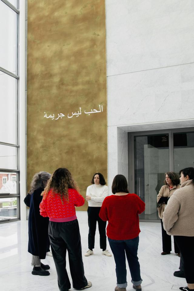 L’amour n’est pas un crime, 2025, installation in situ, henné sur toile, 900 x 350 cm, vues de l’exposition personnelle Harem, 2025, Grand Hall, MACAM – Museu de Arte Contemporânea Armando Martins, Lisbonne, Portugal, photo Francisco Quera-Gomes