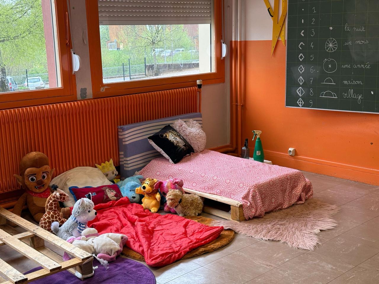 Décor de chambre aménagée dans une salle de classe, Lavans-lès-Saint-Claude, 2025