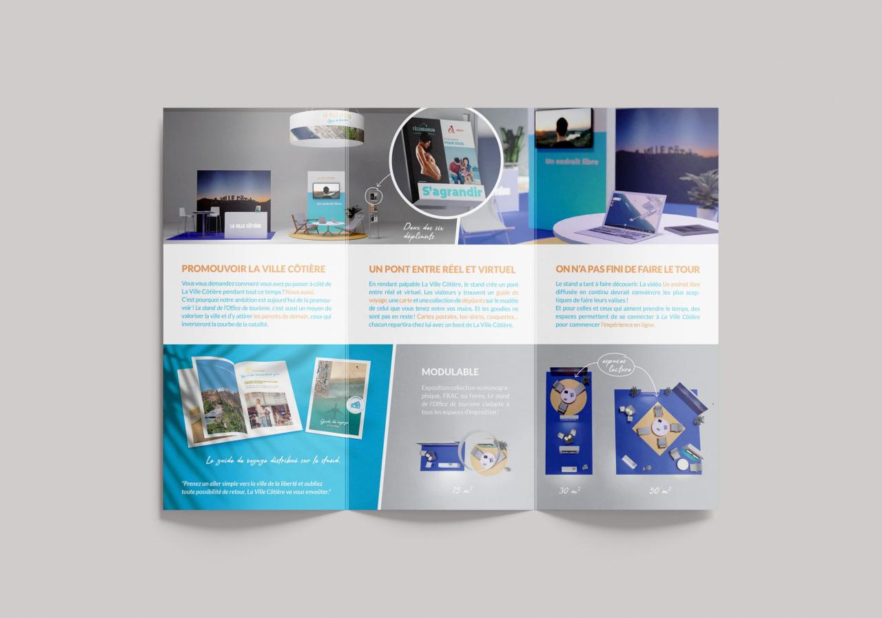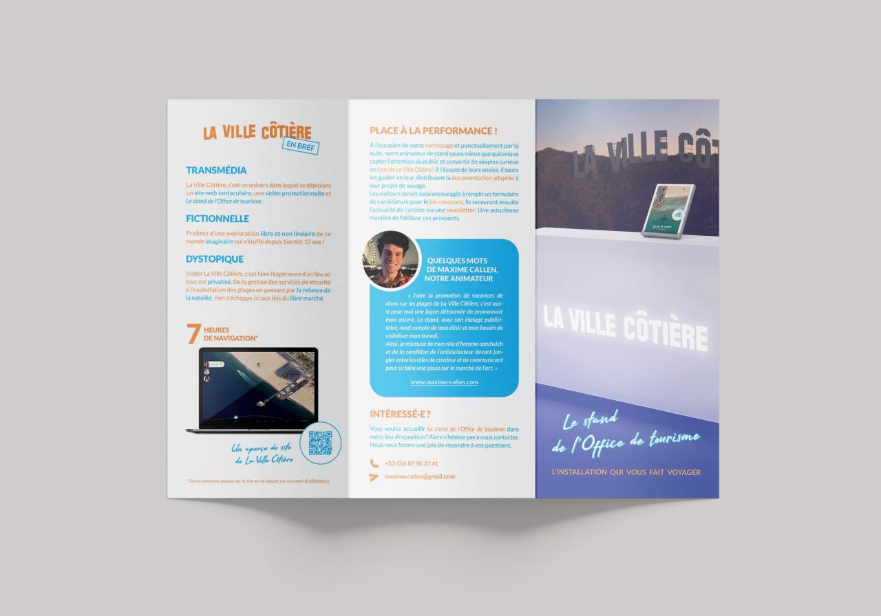 Sur le stand, j’envisage de proposer aux visiteur·ses plusieurs éditions tels qu’un guide de voyage présentant les spécificités de cet univers et des flyers commerciaux de différentes entreprises de La Ville Côtière. La vidéo Un endroit libre qui donne le ton de l’univers y serait diffusée en boucle sur un grand écran. Une zone de lecture équipée d’ordinateurs et de tablettes pourrait aussi être aménagée pour plonger dans lavillecotiere.fr. À cet effet, des QR codes permettraient de relier les éditions à des contenus en ligne.