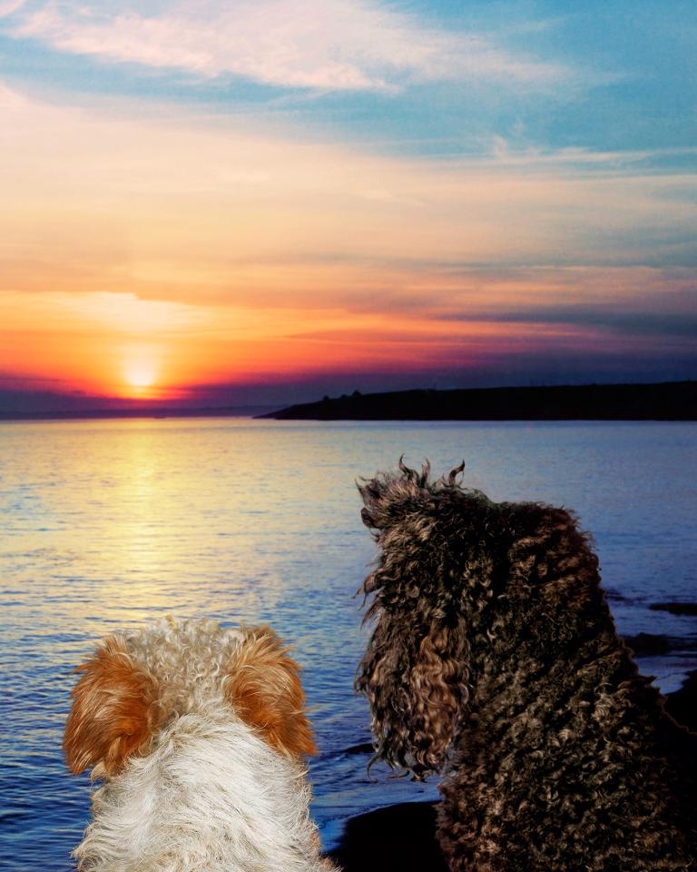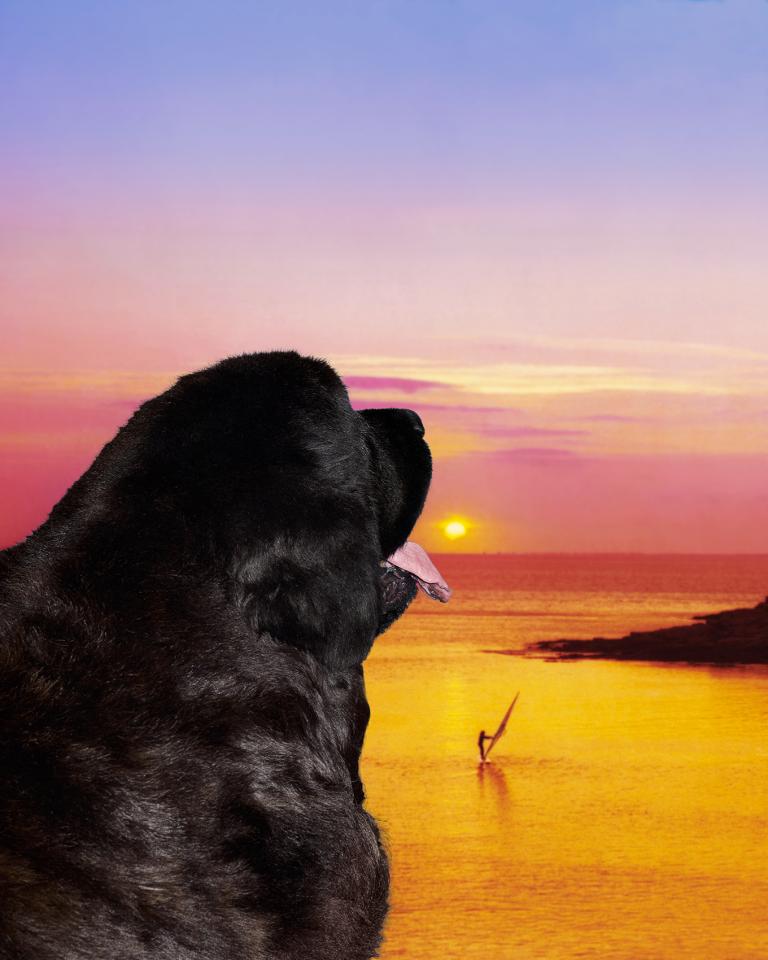 Le deuxième ensemble qui s’intitule Le meilleur Ami du chien agit comme un contrepoint. On y voit des représentants de nos amis canins, de dos, qui semblent perdus dans la contemplation de couchers de soleil romantiques.