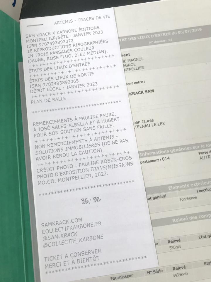 Artemis - Traces de vie, 2023, coffret avec 18 reproductions RISO, un état des lieux d’entrée, un état des lieux de sortie et un plan de salle, 24 x 32 cm fermé, POST FIRE BOOKS, Montpellier, détail