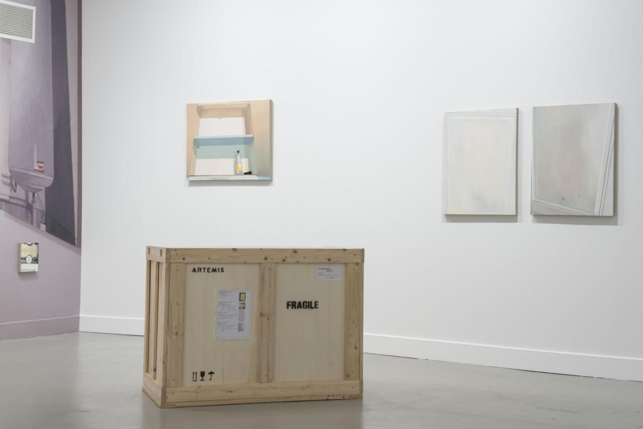 Sam Krack réalise alors les peintures des images témoins de l’état des lieux. 18 toiles sont réalisées au total Pour cette mise en exposition du document administratif. Pour l’état des lieux de sortie deux ans plus tard, ces peintures ont été accrochées dans l’appartement, à proximité des traces de vie visibles sur les murs, les portes, lavabos, placards. Aujourd’hui, l’appartement est habité par un autre. Les toiles sont rangées dans une caisse. L’état des lieux de l’agence les accompagne. L’appartement est en boîte et la caisse est une exposition potentielle et mobile en soit, à déployer, à décliner.