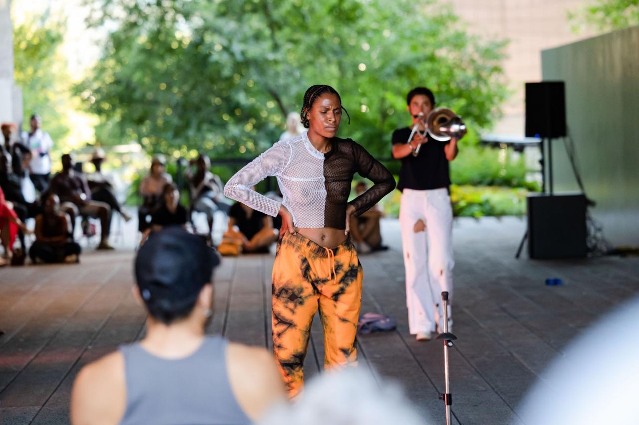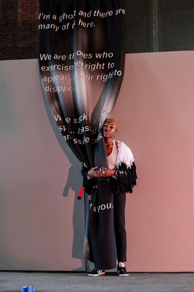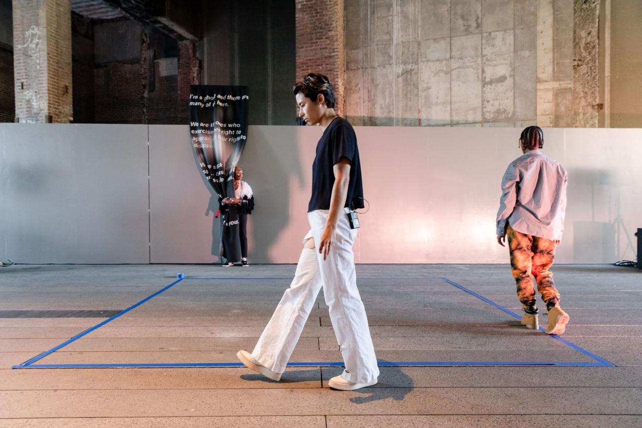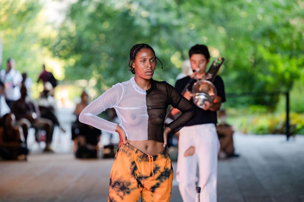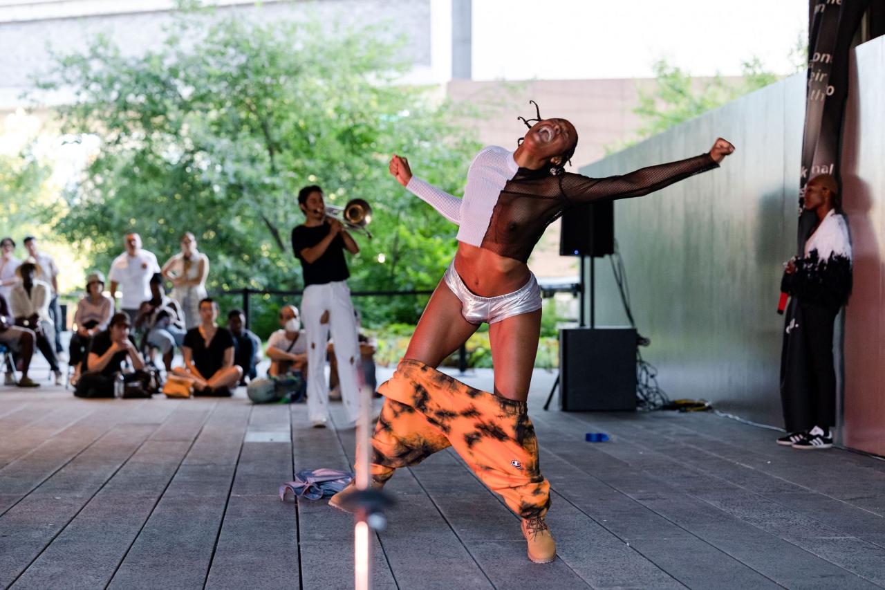 A fire circle for a public hearing témoigne de l’engagement permanent de Maheke à l’égard du potentiel du corps comme archive ; la performance aborde la manière dont l’histoire, la mémoire et l’identité sont formées. Dans cette œuvre, trois interprètes incarnent différents personnages comme s’ils étaient possédés par des entités fantomatiques. Leurs mouvements et leur dialogue explorent l’hypervisibilité et l’effacement tels qu’ils se manifestent dans la marginalisation historique et les mouvements politiques contemporains. Sur la High Line, Maheke présente cette performance captivante pour la première fois aux États-Unis.
