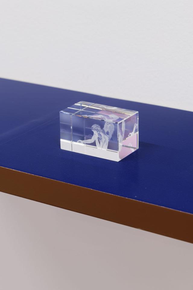 Kasangu ou les mains jeteuses de sorts, 2019, dessins gravés au laser en 3D dans un cube en verre, Le fil d’alerte, 2019, vue de l’exposition, Fondation d’entreprise Pernod Ricard, Paris, photo Aurélien Mole