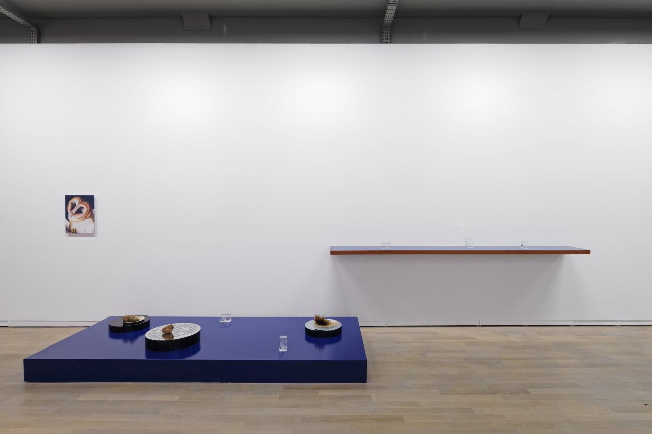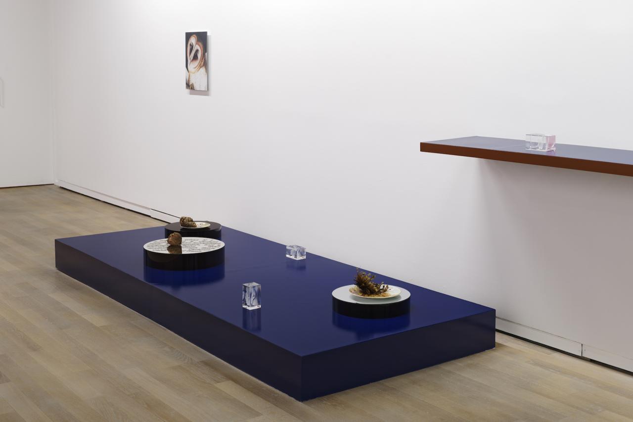 Letter to a barn Owl #1, 2018, techniques mixtes, Letter to a barn Owl #3, 2018, techniques mixtes, Le fil d’alerte, 2019, vue de l’exposition, Fondation d’entreprise Pernod Ricard, Paris, photo Aurélien Mole