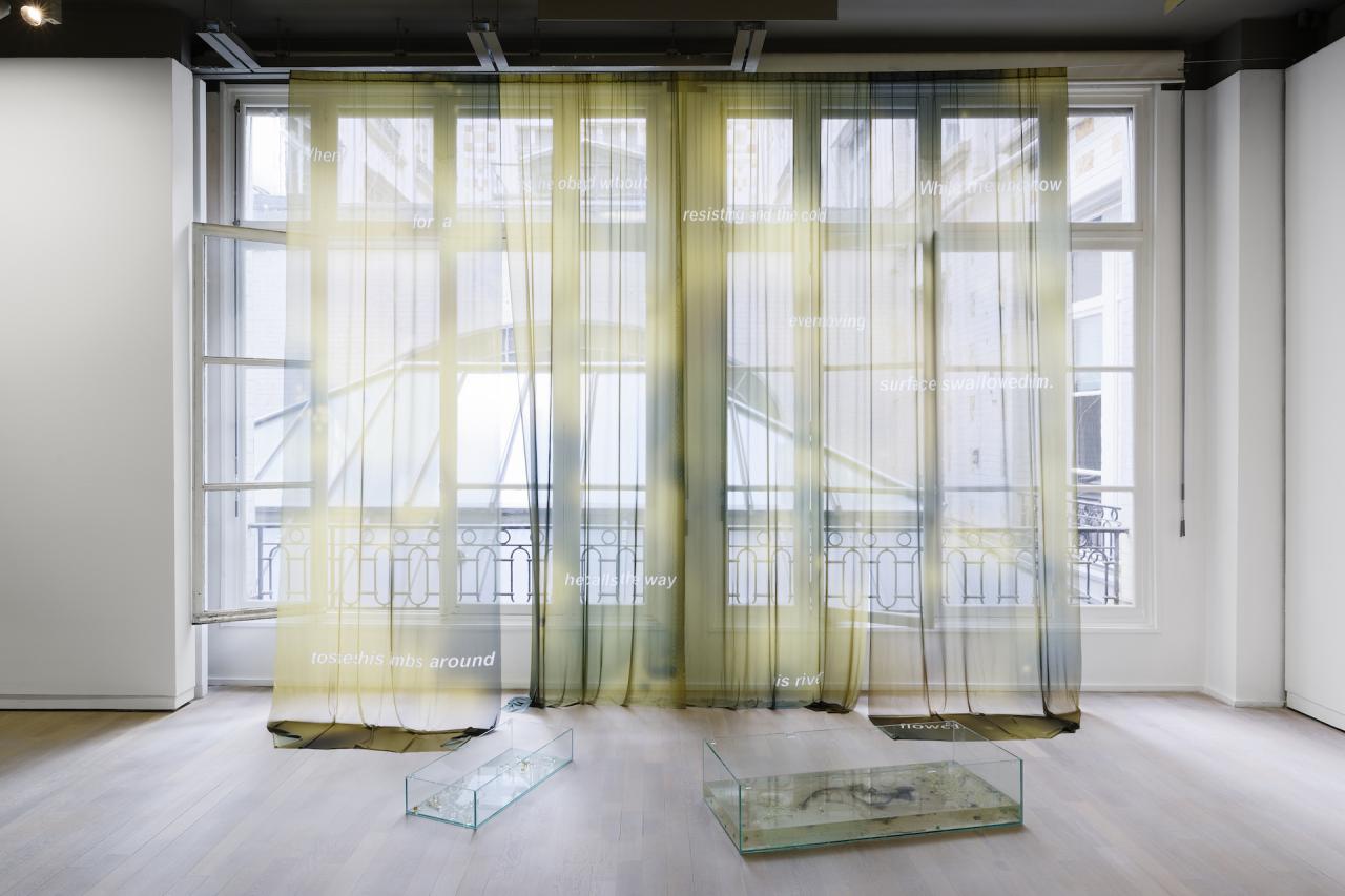 In the watery core of those stories, 2017, installation, The river asked for a kiss (to Pateh Sabally), 2017, installation, vue de l’exposition Le fil d’alerte, 2019, Fondation d’entreprise Pernod Ricard, Paris, détail, photo Aurélien Mole