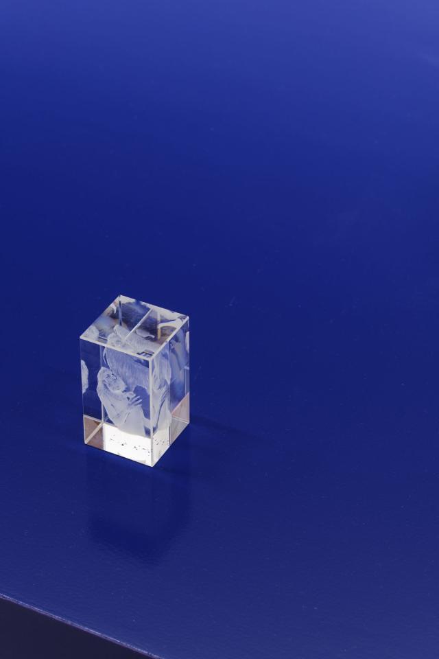 Lucifer/L’ombre et l’augure, 2019, dessins gravés au laser en 3D dans cube en verre, Le fil d’alerte, 2019, vue de l’exposition, Fondation d’entreprise Pernod Ricard, Paris, photo Aurélien Mole