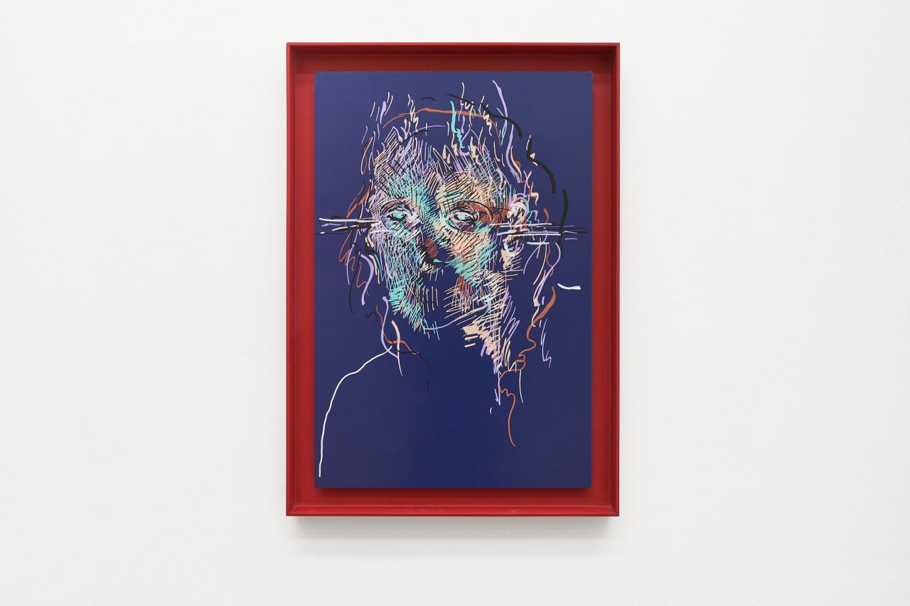 Ancestral Muse II (blue), 2023, feutre acrylique sur aluminium, vue de l’exposition To Be Blindly Hopeful, 2024, Mostyn, Llandudno, Royaume-Uni, détail, photo Rob Battersby