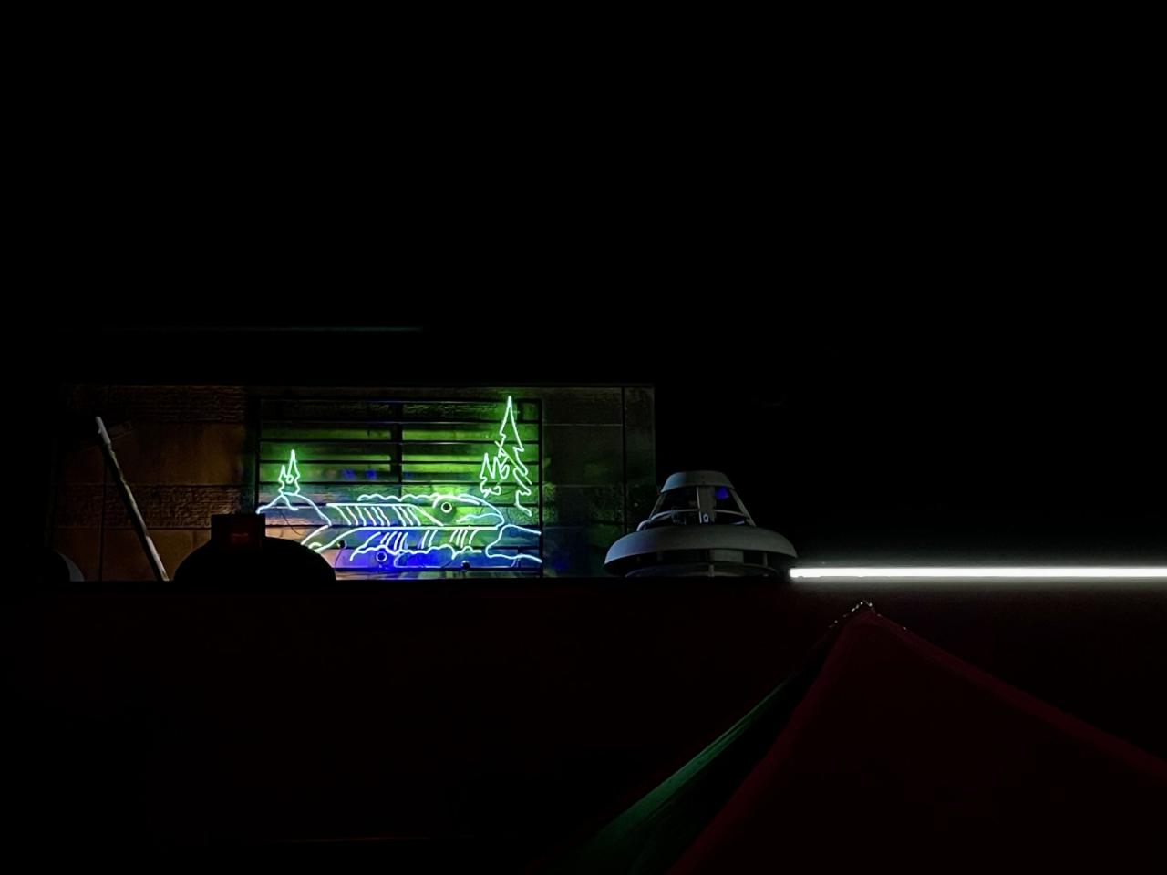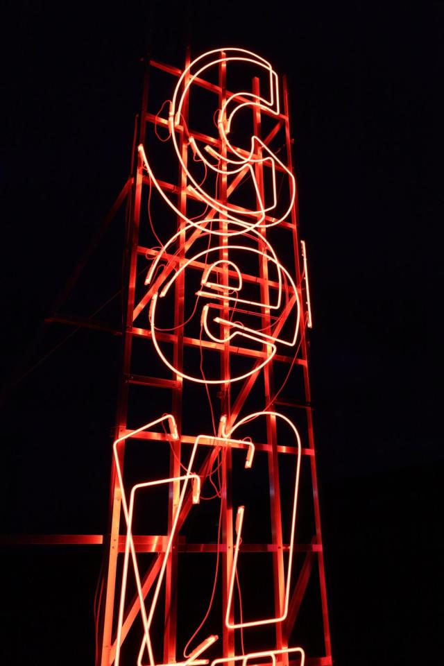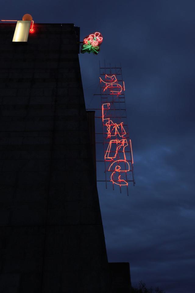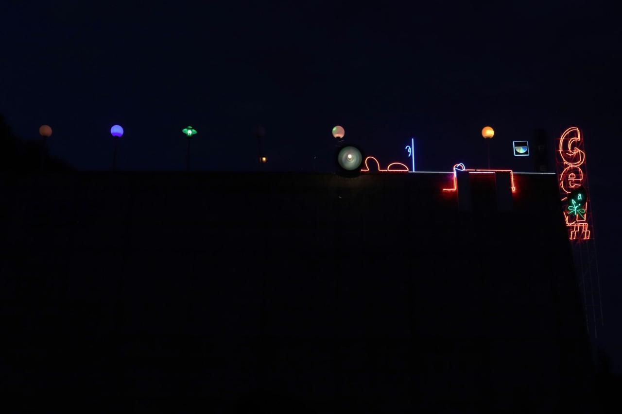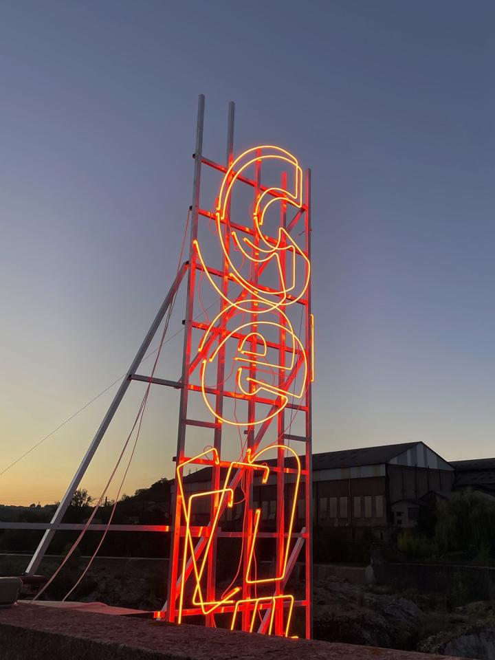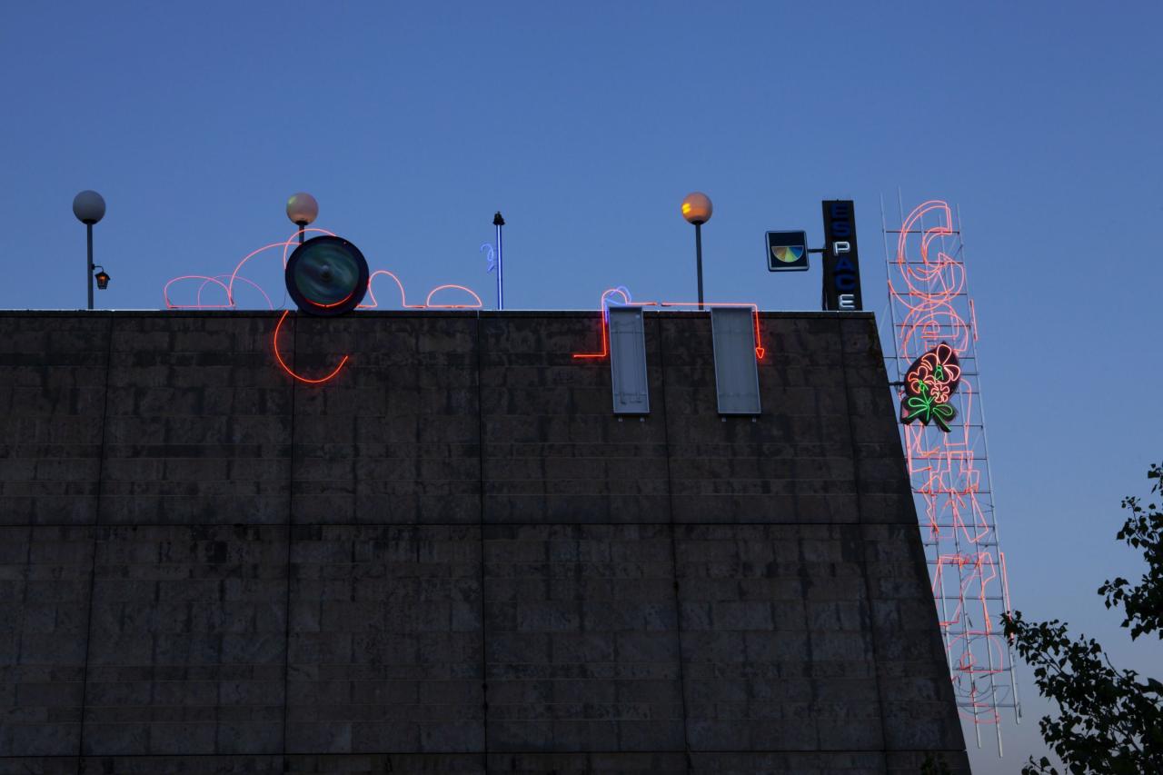 L’Espace au centre, 2023, enseignes lumineuses de réemploi, systèmes électriques, installation in situ à la centrale hydroélectrique d’Arthès, détail