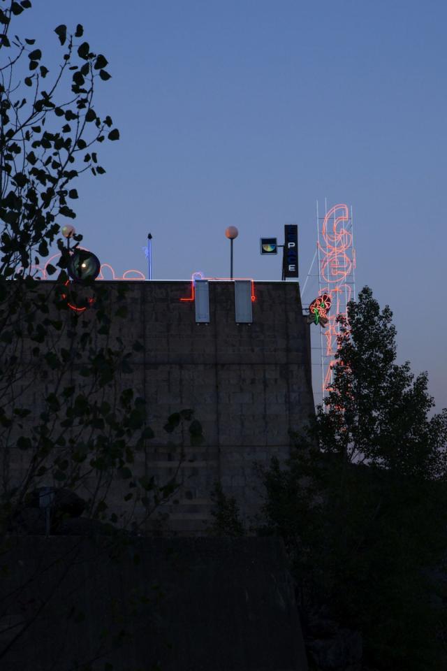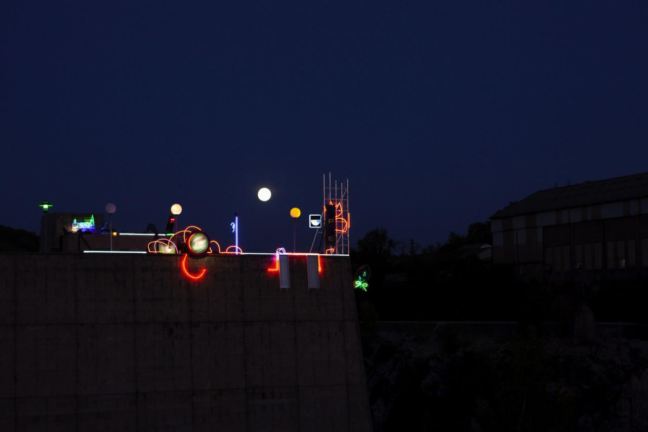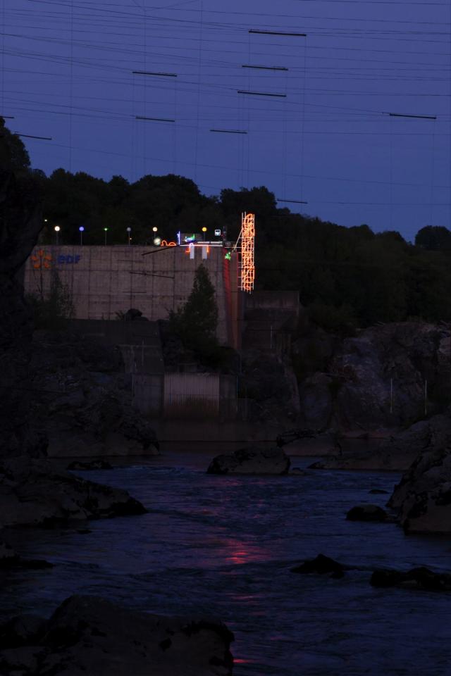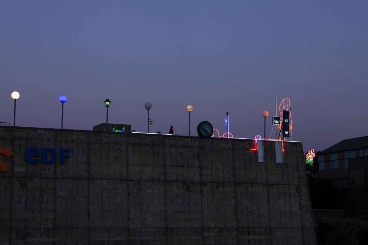 L’Espace au centre, 2023, enseignes lumineuses de réemploi, systèmes électriques, installation in situ à la centrale hydroélectrique d’Arthès, photos Phoebe Meyer