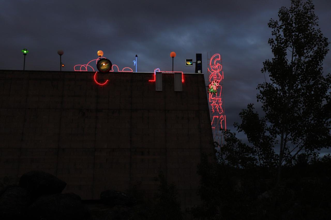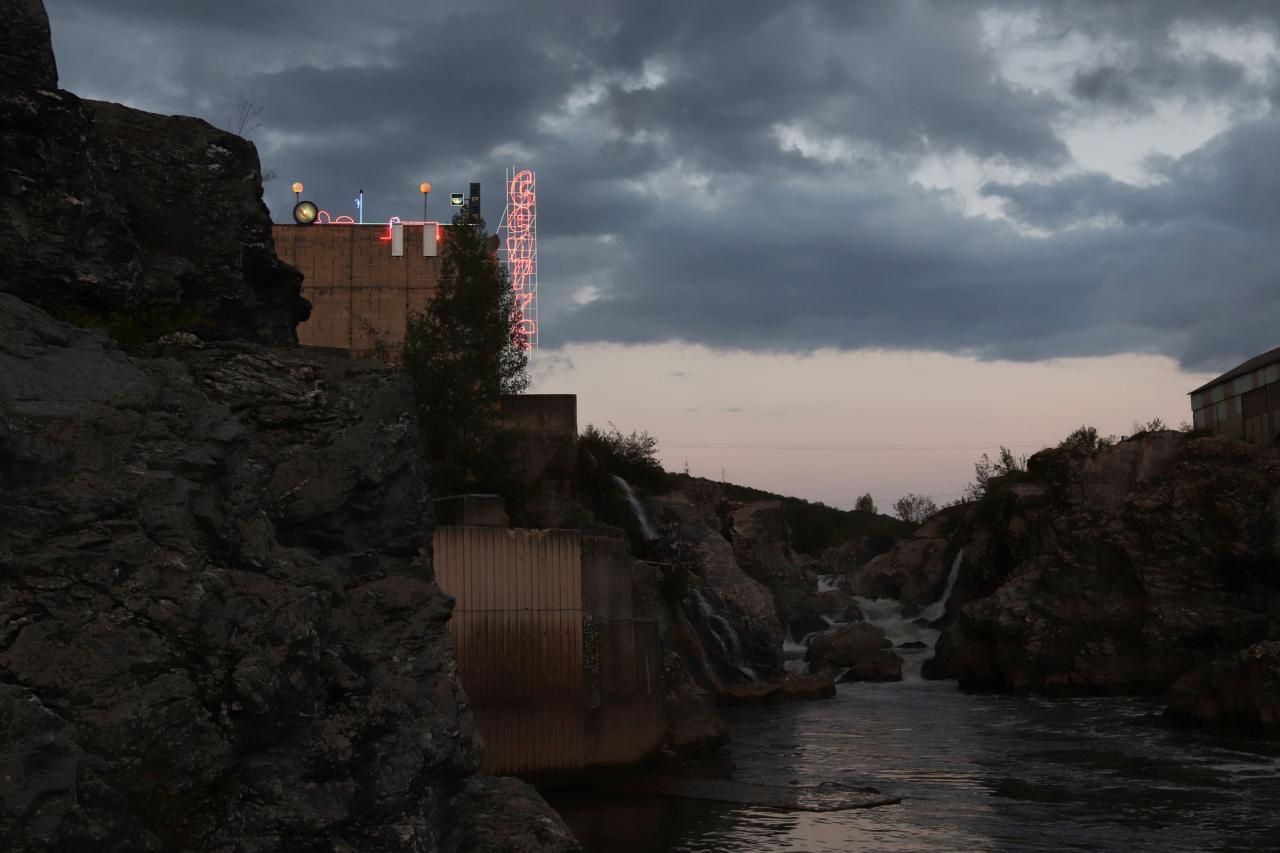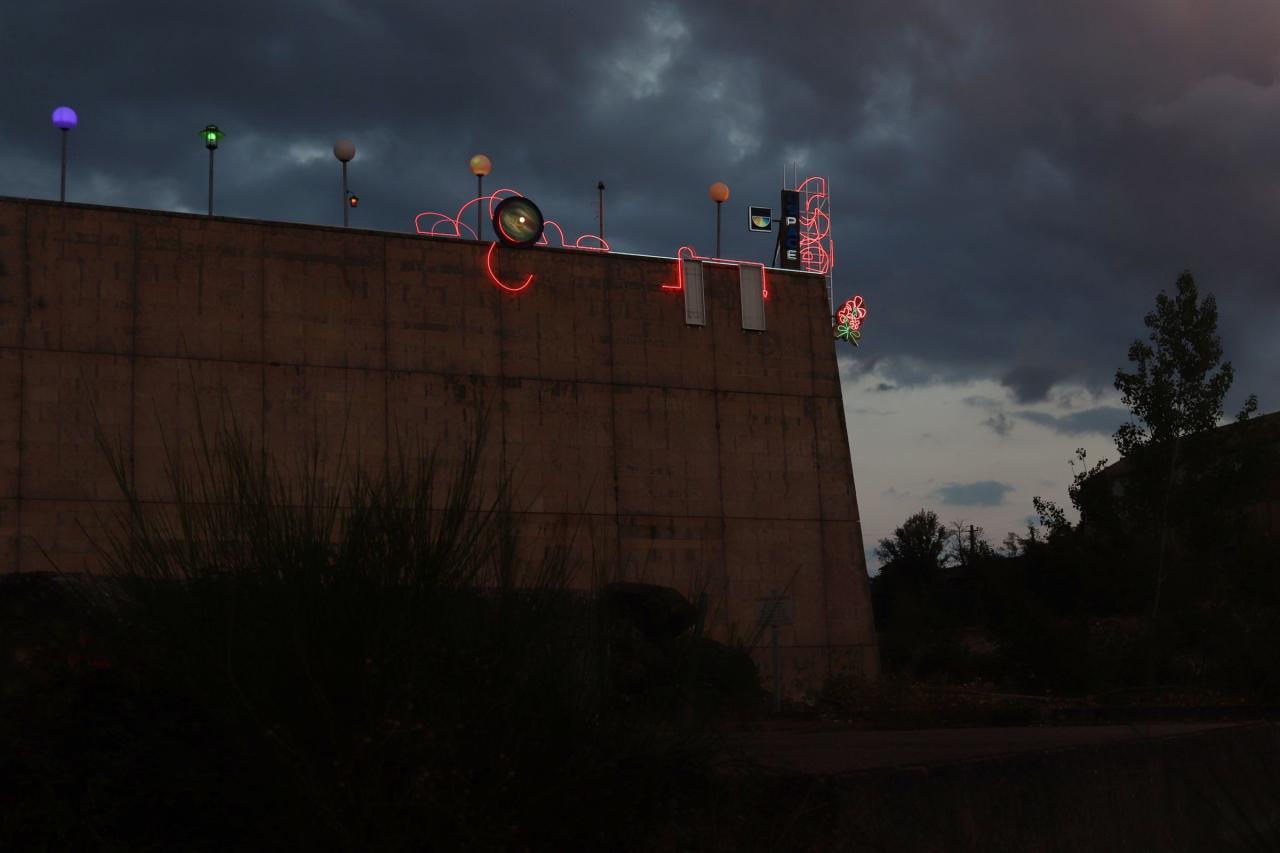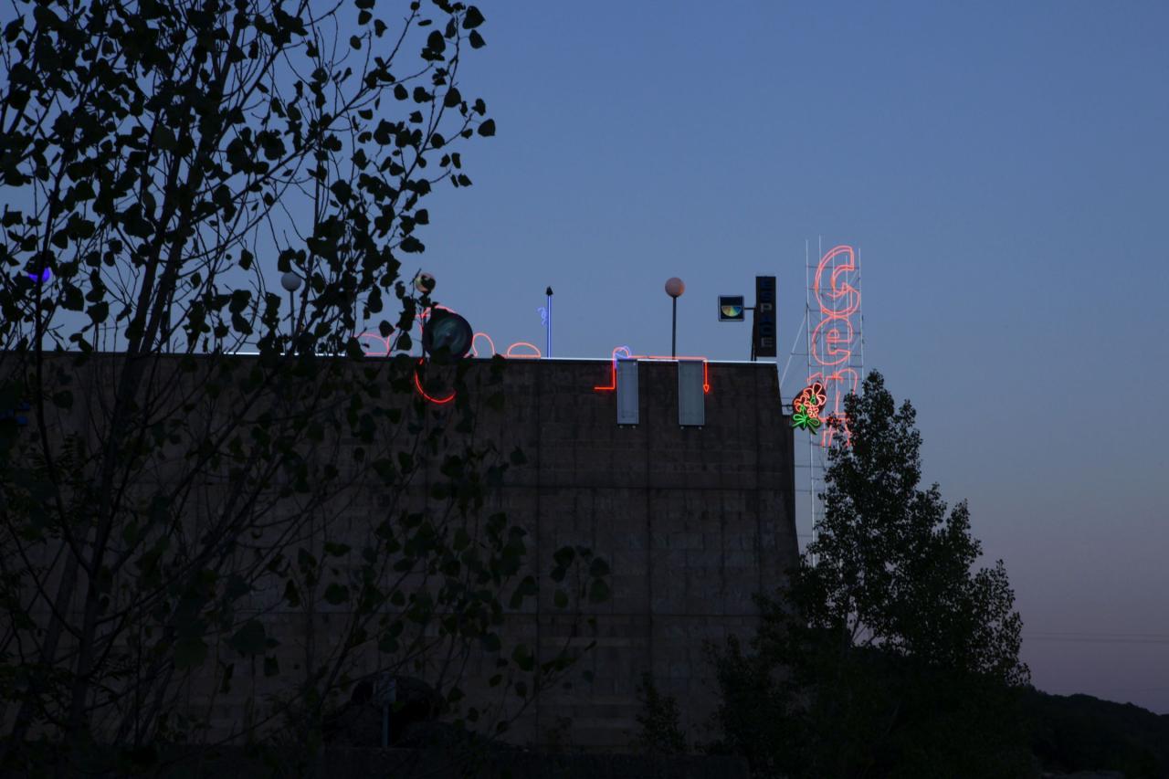L’Espace au centre, 2023, enseignes lumineuses de réemploi, systèmes électriques, installation in situ à la centrale hydroélectrique d’Arthès, photos Phoebe Meyer