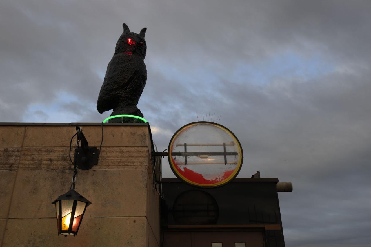 Héron libre, pose toi près du hibou de pierre. Celui-ci veille d’un œil et de l’autre vacille, éclairé à la base d’un cercle vert clair. Lancinante lanterne au vitrail qui brille.
