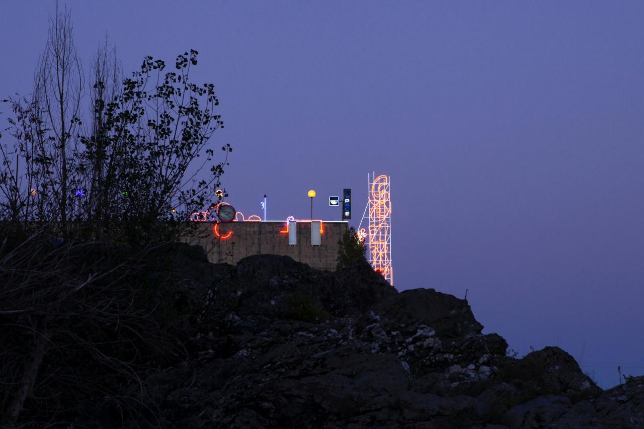 L’Espace au centre, 2023, enseignes lumineuses de réemploi, systèmes électriques, installation in situ à la centrale hydroélectrique d’Arthès, photo Phoebe Meyer