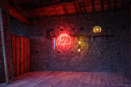 Boire à sa lumière, 2025, assemblage d’éléments lumineux, néons, lampes, faux feux et crémaillères anciennes, structure en bois, animateurs électriques et interrupteurs autonomes, installation in-situ, Entorns, Musser, Espagne