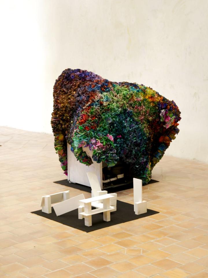 Sans titre (corso n°4), 2015, papier crépon, grillage et réfrigérateur, 120 x 140 x 96 cm, vue de l’exposition en duo avec Rémi Magnouat Fin de partie, 2016, Abbaye de Saint-Hilaire, Saint-Hilaire