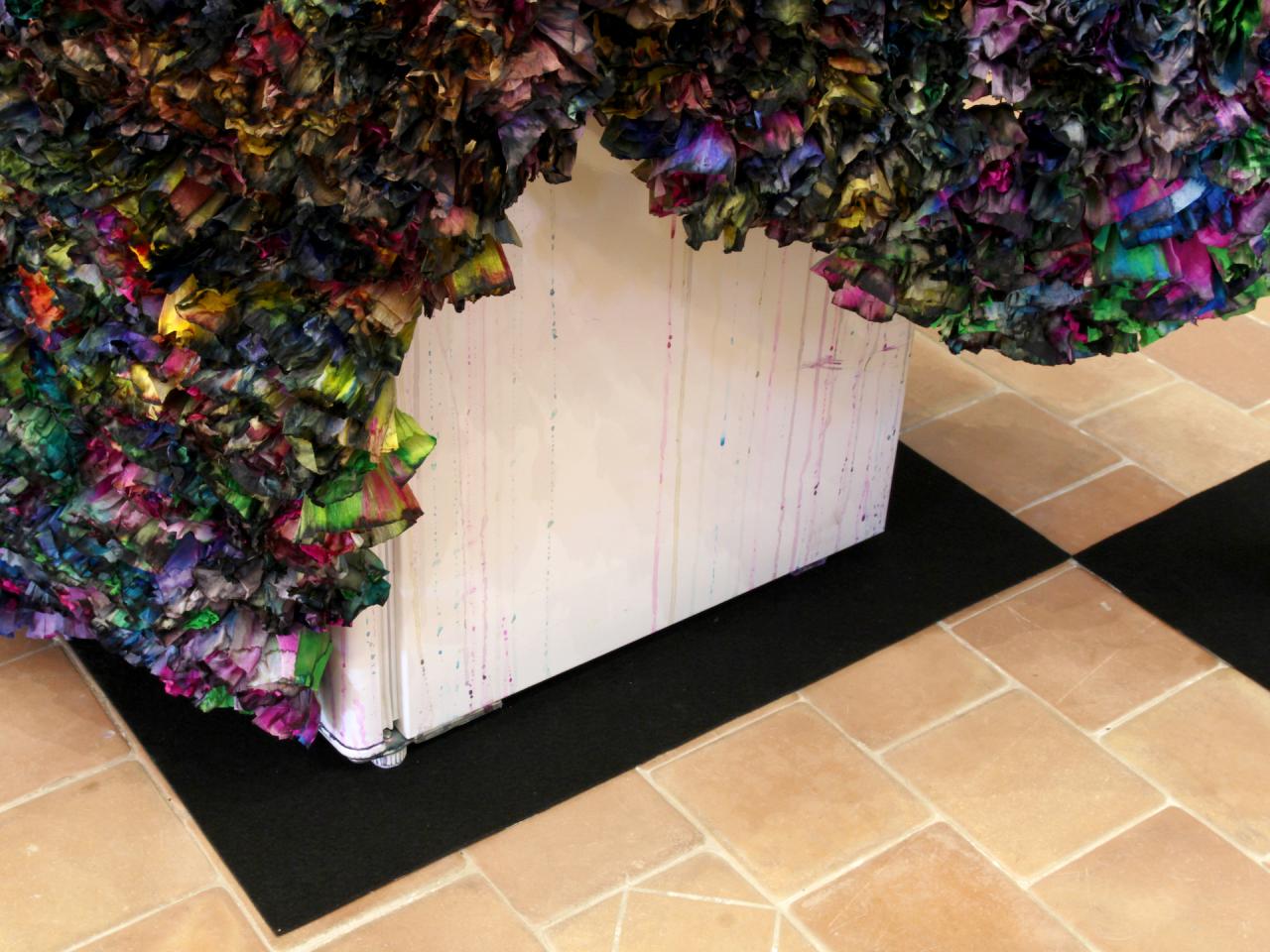 Sans titre (corso n°4), 2015, papier crépon, grillage et réfrigérateur, 120 x 140 x 96 cm, vue de l’exposition en duo avec Rémi Magnouat Fin de partie, 2016, Abbaye de Saint-Hilaire, Saint-Hilaire, détail