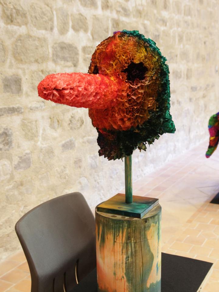 Sans titre (masque n°1), 2016, papier crépon, grillage, bois, plâtre, 80 x 60 x 45 cm, vue de l’exposition en duo avec Rémi Magnouat Fin de partie, 2016, Abbaye de Saint-Hilaire, Saint-Hilaire, détail