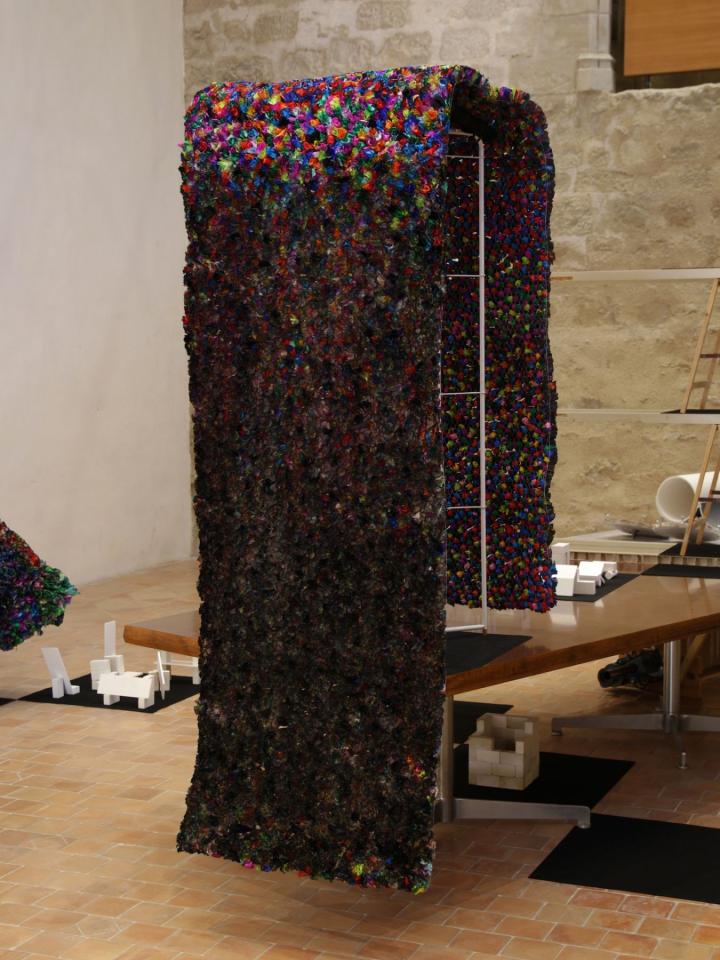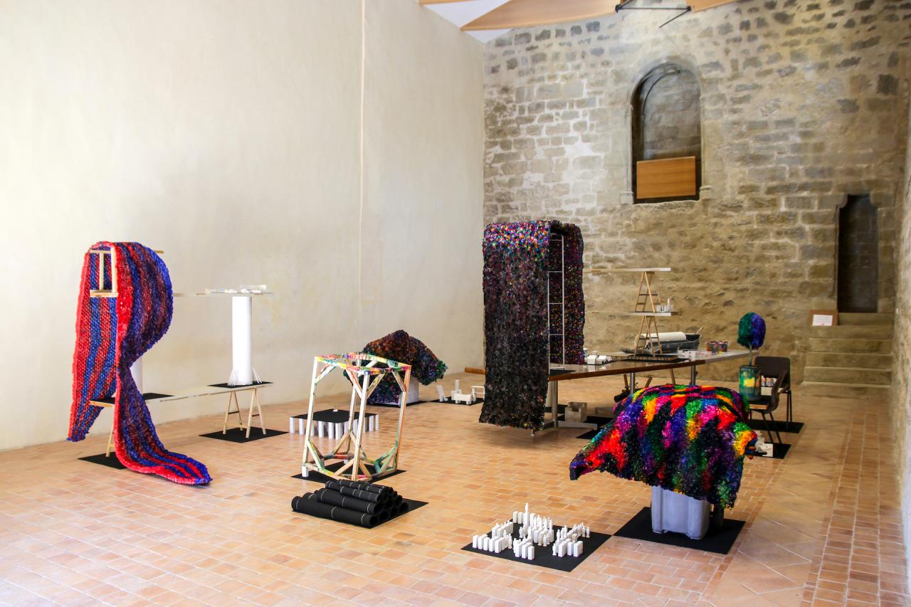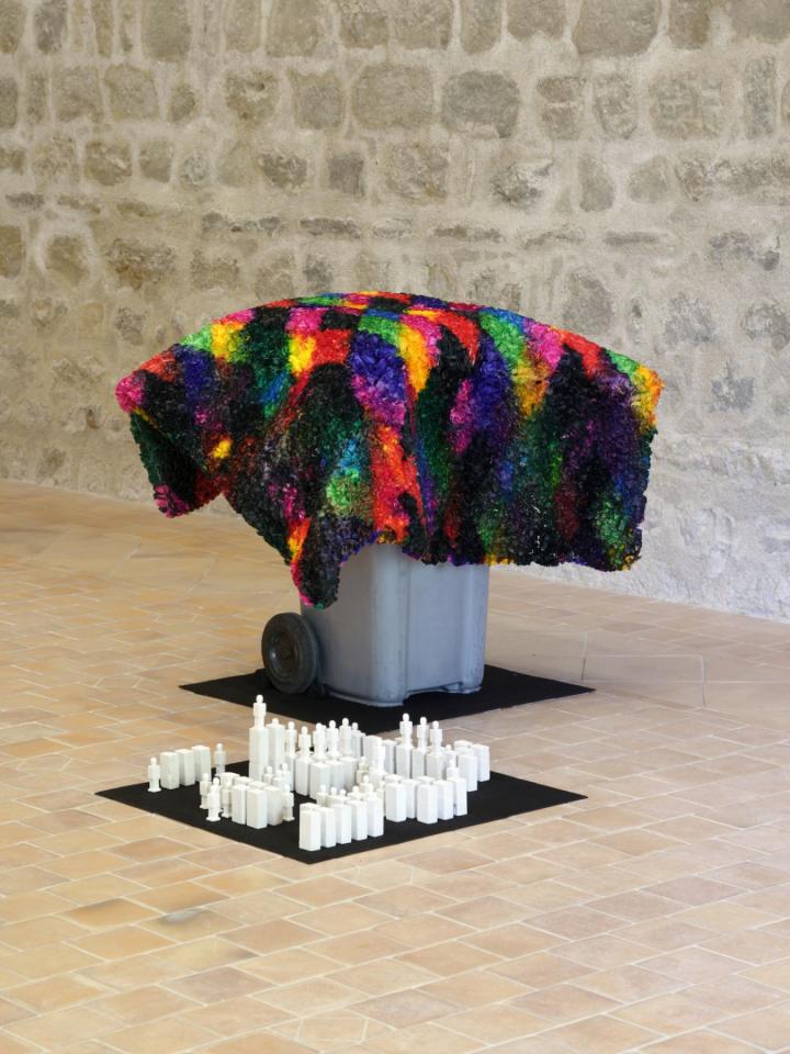 Sans titre (corso n°2), 2013, papier crépon, grillage et poubelle, 80 x 200 x 80 cm, vue de l’exposition en duo avec Rémi Magnouat Fin de partie, 2016, Abbaye de Saint-Hilaire, Saint-Hilaire