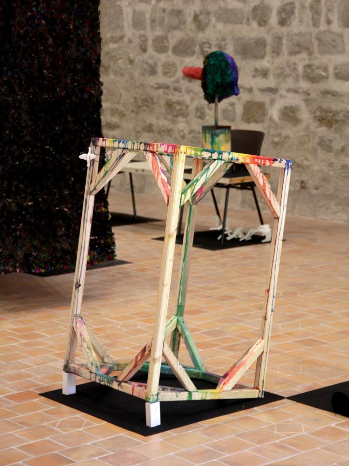 Structure de Sans titre (Corso n°2) basculée, 2016, en collaboration avec Rémi Magnouat, bois, plâtre et pigments, 60 x 110 x 60 cm, vue de l’exposition en duo avec Rémi Magnouat Fin de partie, 2016, Abbaye de Saint-Hilaire, Saint-Hilaire
