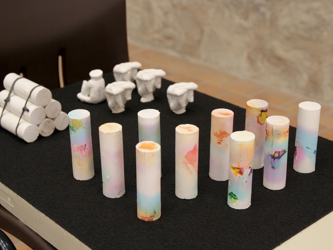 Déploiement, 2016, cylindres en plâtre et papier crépon, en collaboration avec Rémi Magnouat, 10 éléments de 2 x 2 x 8 cm, vue de l’exposition en duo avec Rémi Magnouat Fin de partie, 2016, Abbaye de Saint-Hilaire, Saint-Hilaire