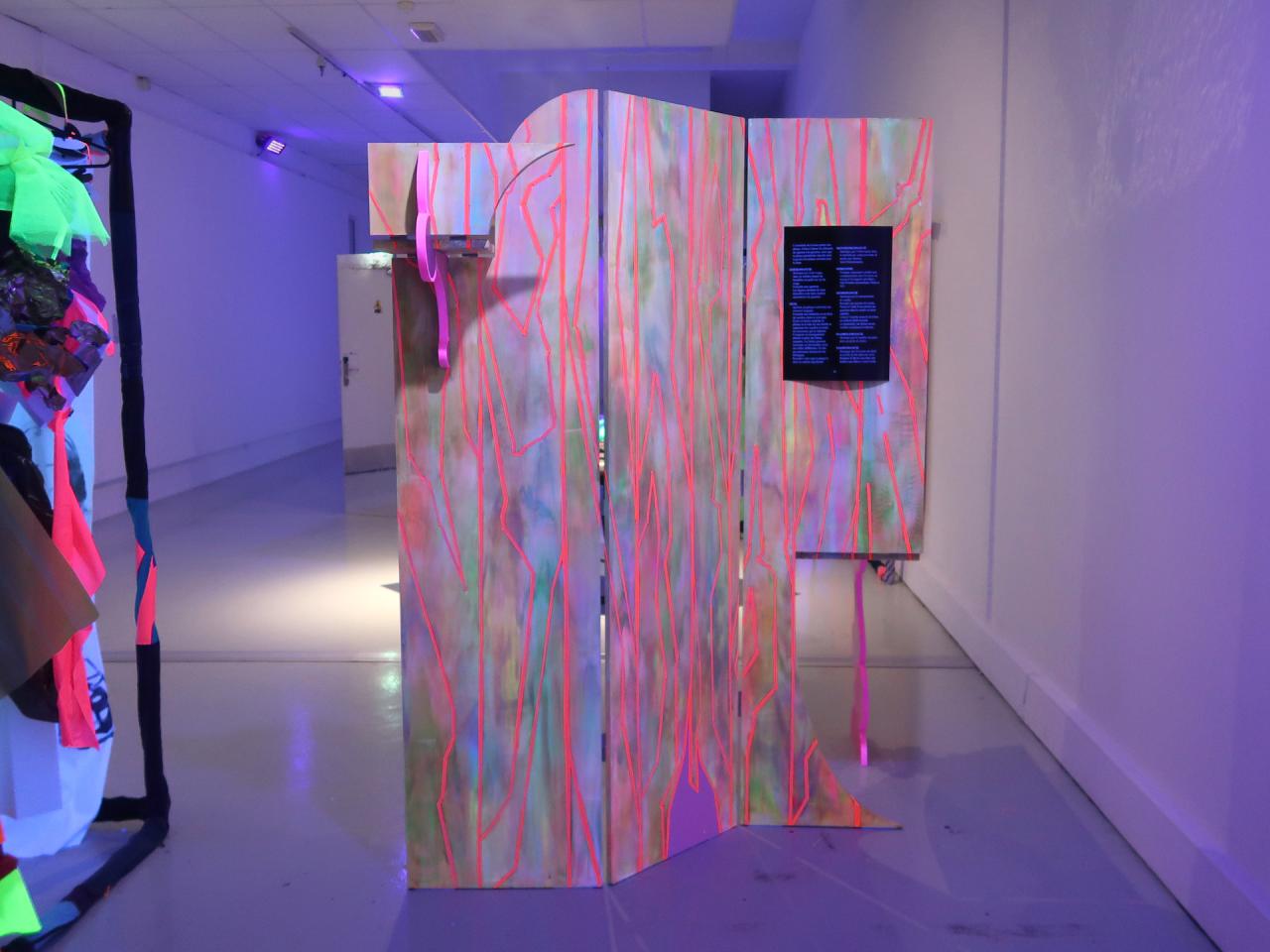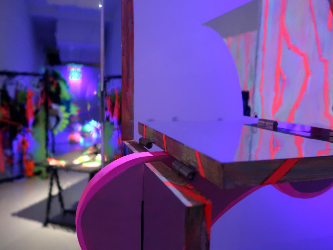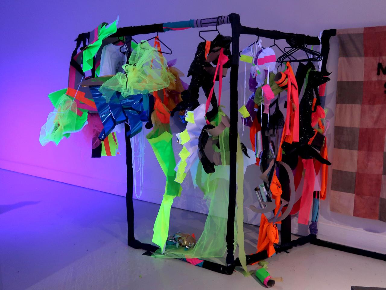Troubleshop, 2023, installation, en collaboration avec Maud Cazaux, vue de l’exposition FLUO PARTY : art, mode, musique, 2023, La Fabrique, Toulouse