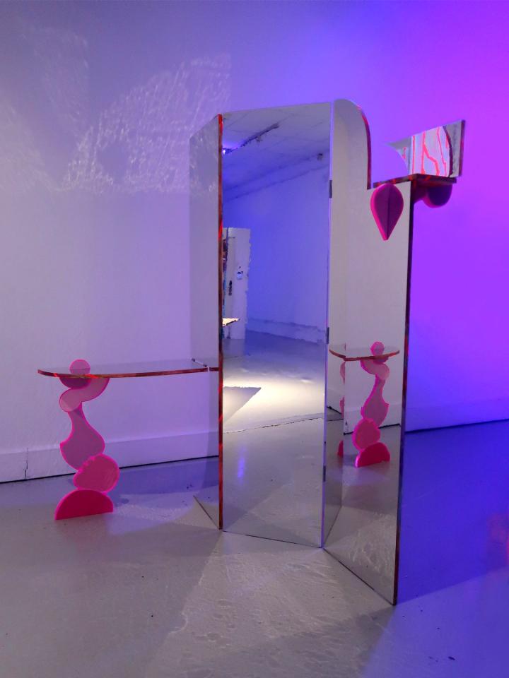 Sans titre (mobilier de déguisement n°1), 2023, MDF, acrylique, charnières, miroir et adhésif, 200 x 200 cm (dimensions variables), vue de l’exposition FLUO PARTY : art, mode, musique, 2023, La Fabrique, Toulouse, détail