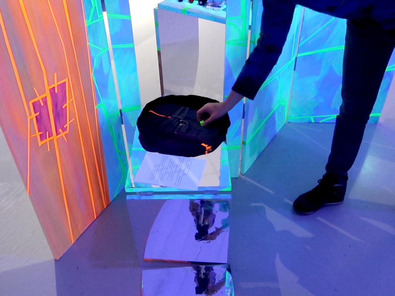 Sans titre (mobilier de déguisement n°2), 2023, MDF, acrylique, charnières, miroir et adhésif, 200 x 200 cm (dimensions variables), Sans titre (tirage), 2023, jeu, tissus, jeans recyclés, dés, instruction de tirage, 40 x 40 cm, activé lors de l’atelier Troubleshop n°1, vue de l’exposition FLUO PARTY : art, mode, musique, 2023, La Fabrique, Toulouse, détail