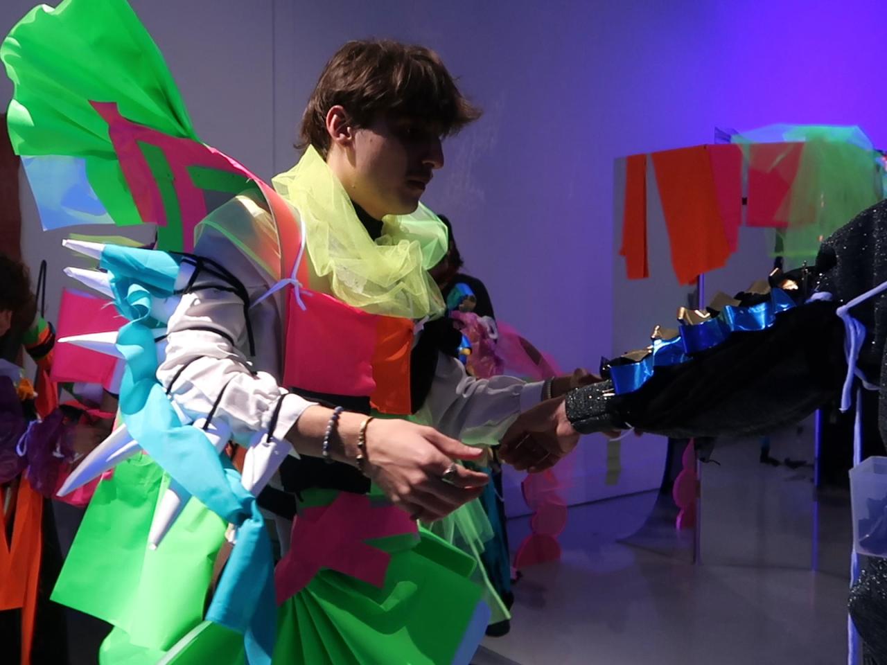 Sans titre (portant n°2), 2023, installation, tubes d’acier vêtements recyclés et tissus, travaux des participant·es aux ateliers Troubleshop, 2023, mené en collaboration avec Maud Cazaux, avec les étudiant·es de l’Université Toulouse Jean Jaurès, Toulouse, tissus, papier, carton, sac plastiques, scotch, ficelles et cintres, vue de l’exposition FLUO PARTY : art, mode, musique, 2023, La Fabrique, Toulouse, détail