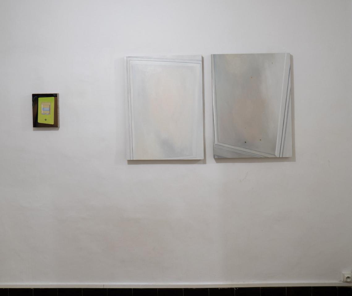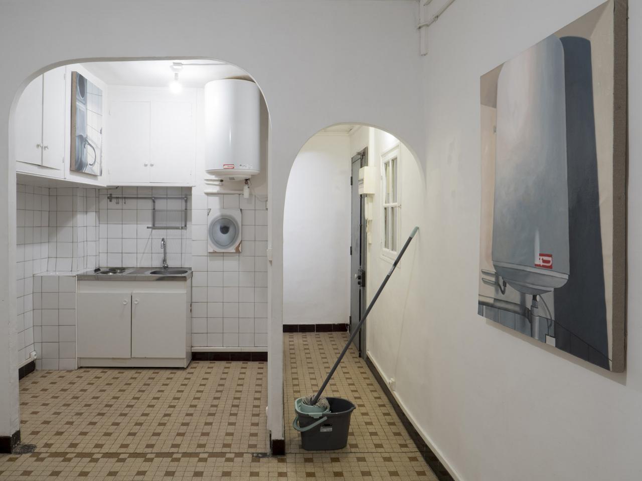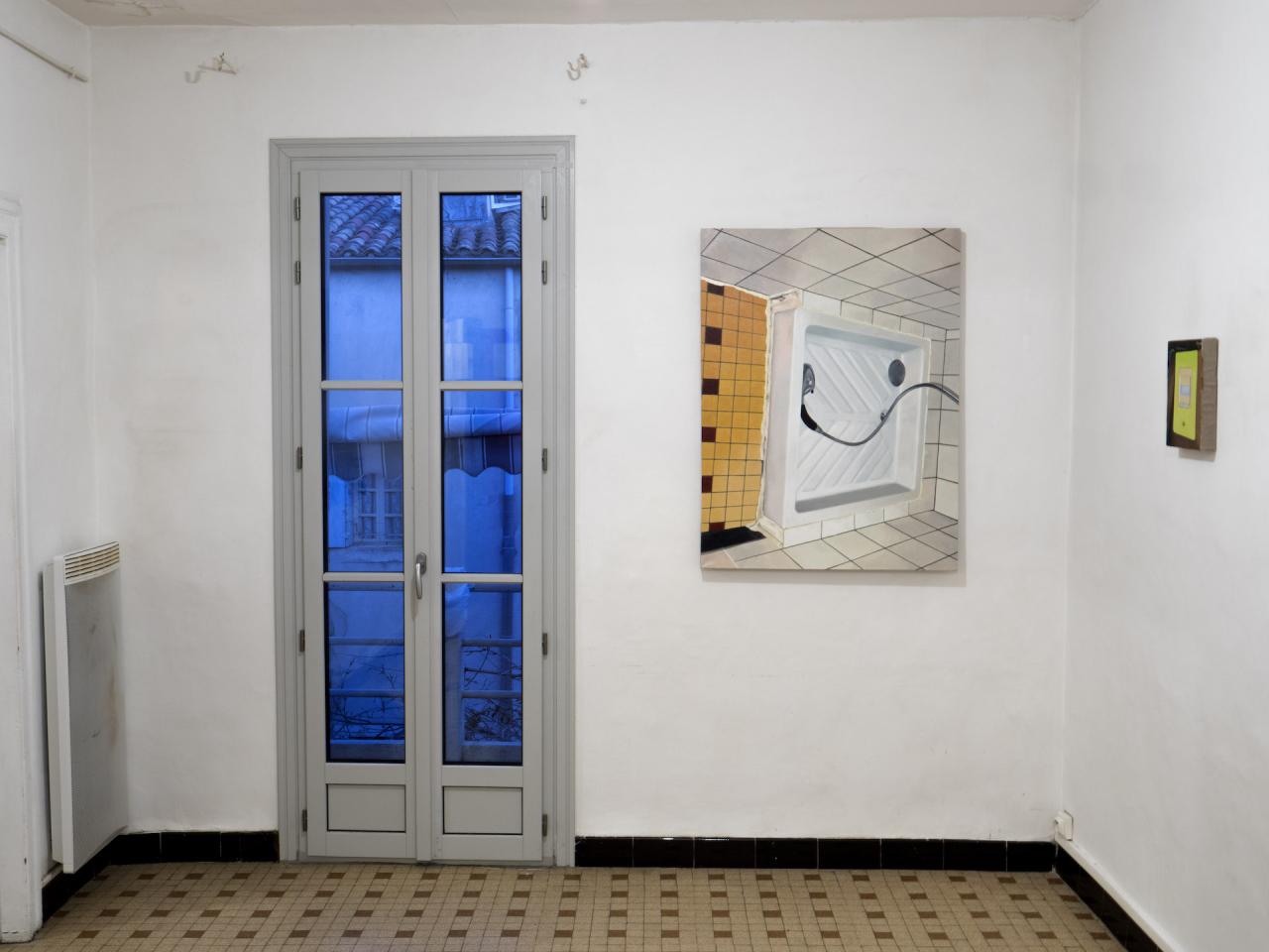 Sam Krack réalise alors les peintures des images témoins de l’état des lieux. 18 toiles sont réalisées au total Pour cette mise en exposition du document administratif. Pour l’état des lieux de sortie deux ans plus tard, ces peintures ont été accrochées dans l’appartement, à proximité des traces de vie visibles sur les murs, les portes, lavabos, placards. Aujourd’hui, l’appartement est habité par un autre. Les toiles sont rangées dans une caisse. L’état des lieux de l’agence les accompagne. L’appartement est en boîte et la caisse est une exposition potentielle et mobile en soit, à déployer, à décliner.
