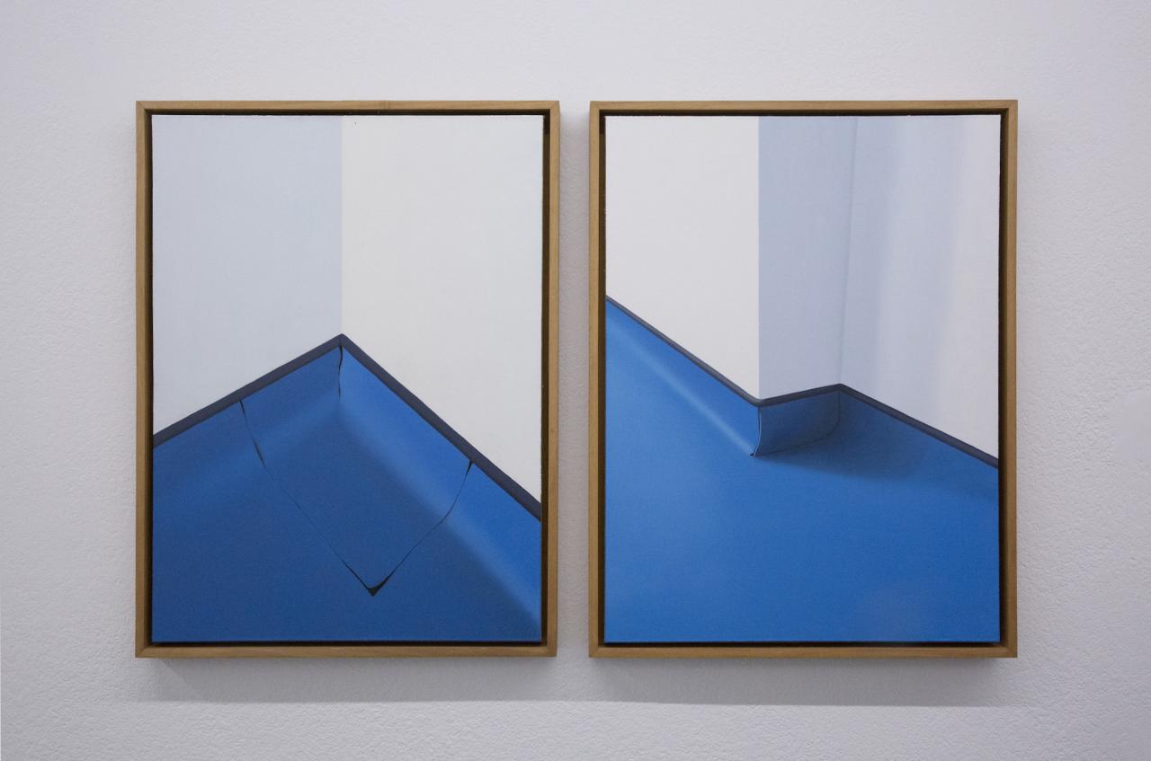 Litige Linoleum (neptune blue 1) et Litige Linoleum (neptune blue 2), 2024, huiles sur lin, vue de l’exposition collective Un monde fissuré, 2025, CACN, Nîmes, photo Sandy Korzekwa