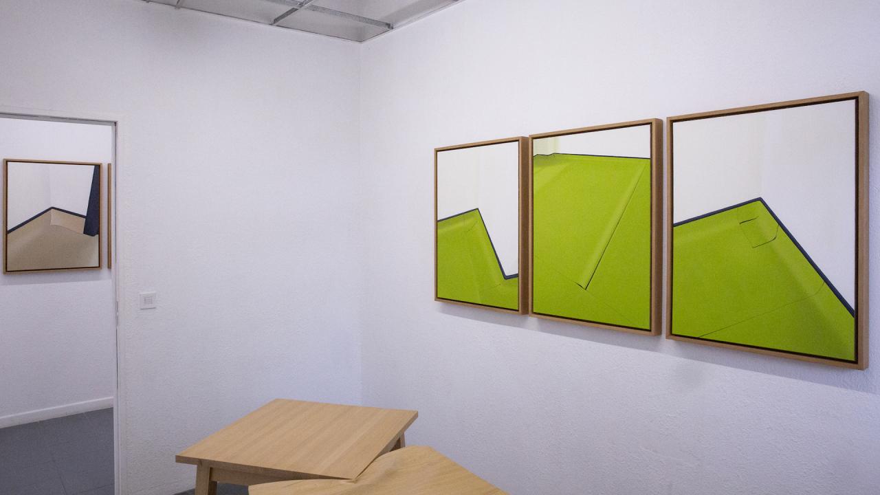 Litige Linoleum (nettle green 1), Litige Linoleum (nettle green 2) et Litige Linoleum (nettle green 3), 2024, huiles sur lin, vue de l’exposition collective Un monde fissuré, 2025, CACN, Nîmes, photo Sandy Korzekwa