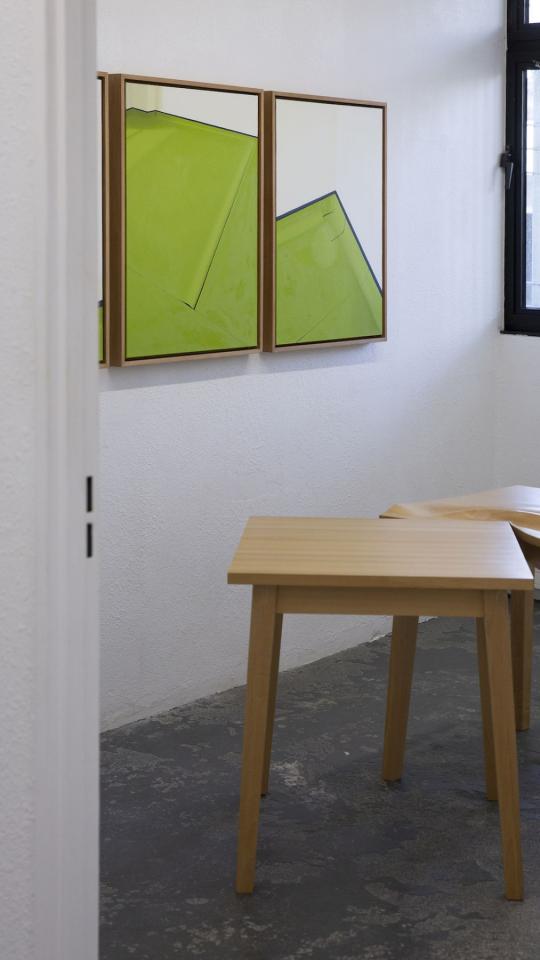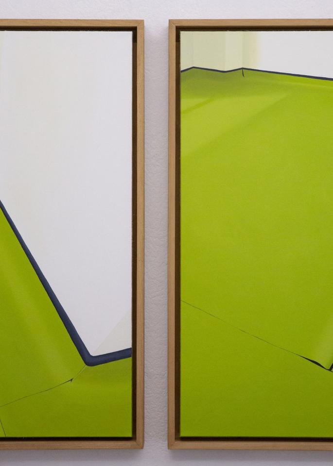 Litige Linoleum (nettle green 1) et Litige Linoleum (nettle green 2), 2024, huiles sur lin, vue de l’exposition collective Un monde fissuré, 2025, CACN, Nîmes, détail, photo Sandy Korzekwa