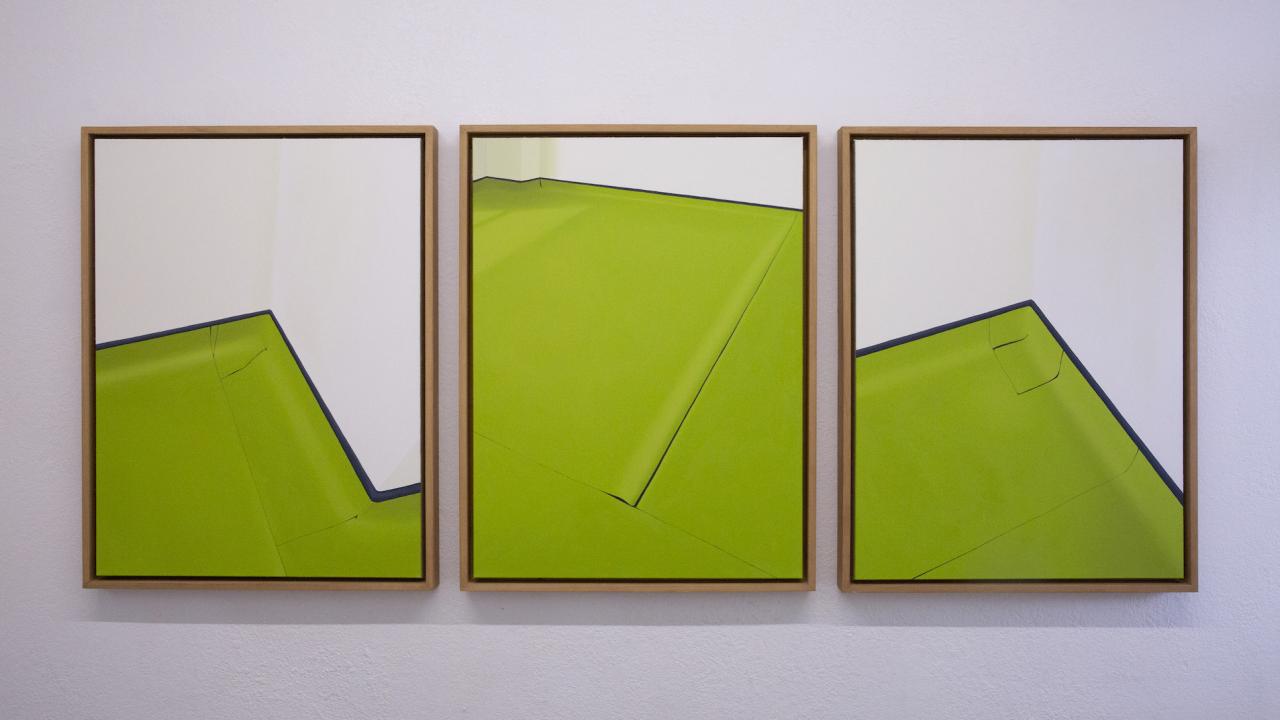Litige Linoleum (nettle green 1), Litige Linoleum (nettle green 2), Litige Linoleum (nettle green 3), 2024, huiles sur lin, 60 x 80 cm chacune