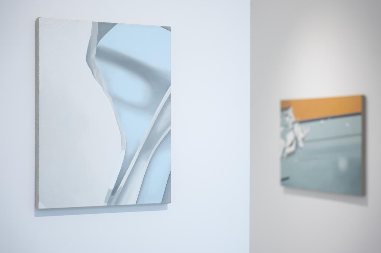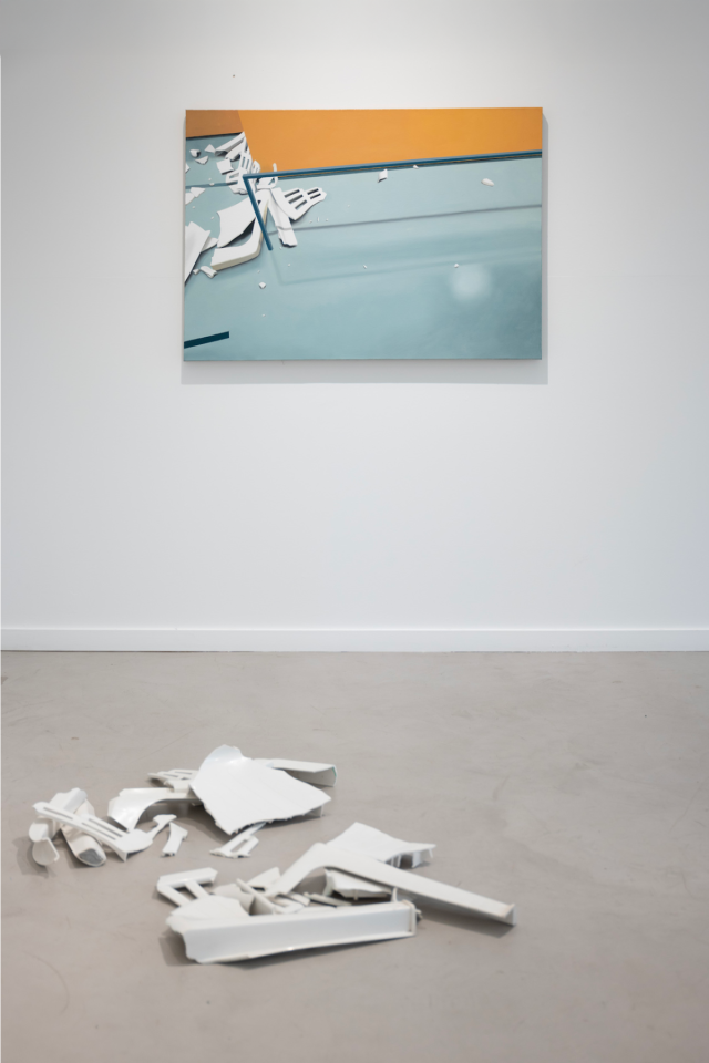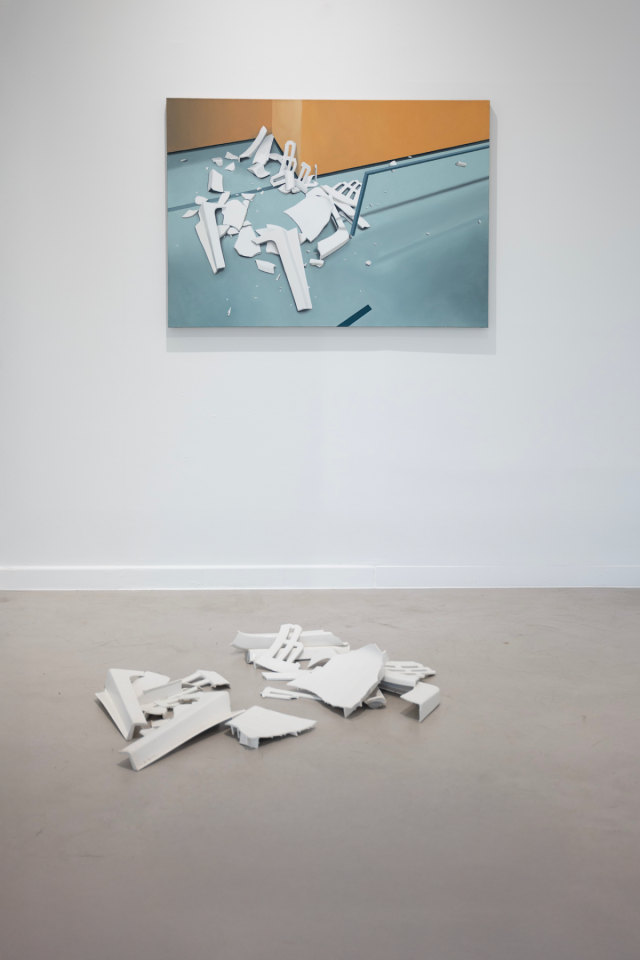 Nouveau sinistre II, 2023, huile sur lin, 85 x 120 cm, Fragments, 2023, installation, polypropylène, vue de l’exposition personnelle Traces de vie, 2023, Valerius Gallery, Luxembourg, photo Tom Jungbluth