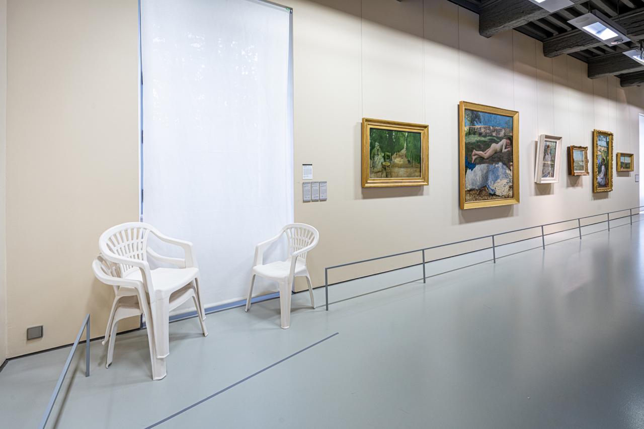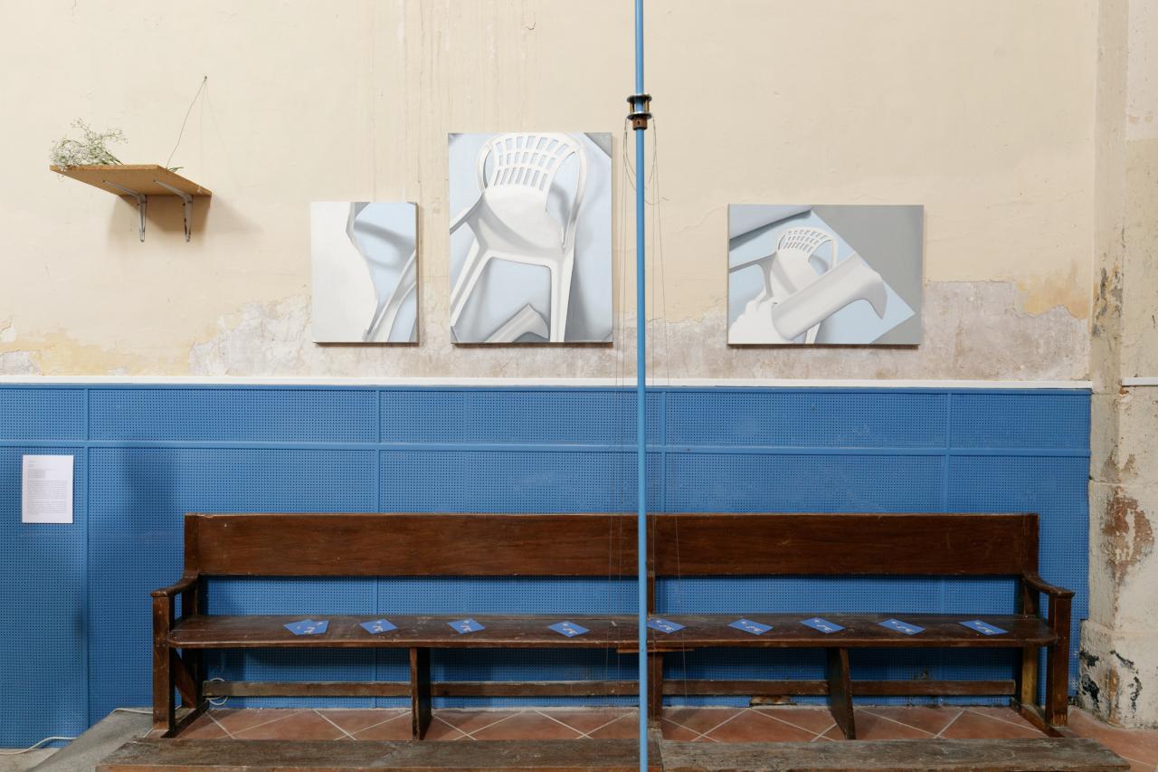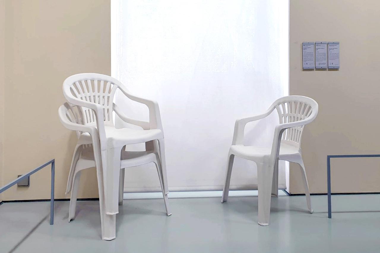 Salon de jardin (chaises), 2022, installation, faïence, 92 x 52 x 41 cm chaque chaise, vue de l’exposition collective Après l’école, 2022, Musée Fabre, Montpellier