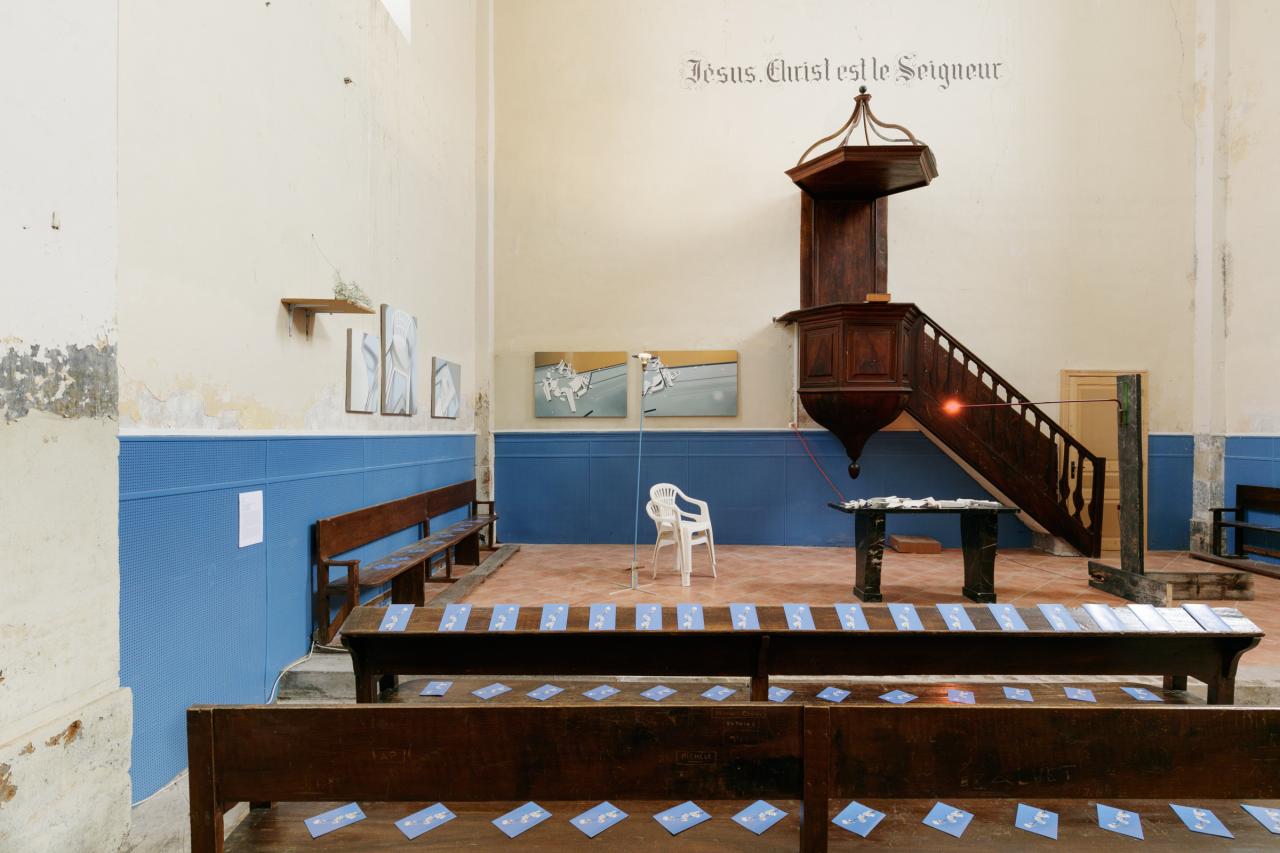 Sinistres(s), 2023, installation, vue de l’exposition collective Le temps est court, 2023, dans le cadre de Faugères Art Of Campagne, Temple protestant, Faugères, photo Louis de Belle