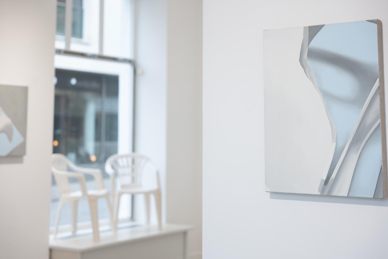 Nouveau sinistre I, 2023, huile sur lin, 85 x 120 cm, Fragments, 2023, installation, polypropylène, vue de l’exposition personnelle Traces de vie, 2023, Valerius Gallery, Luxembourg, photo Tom Jungbluth